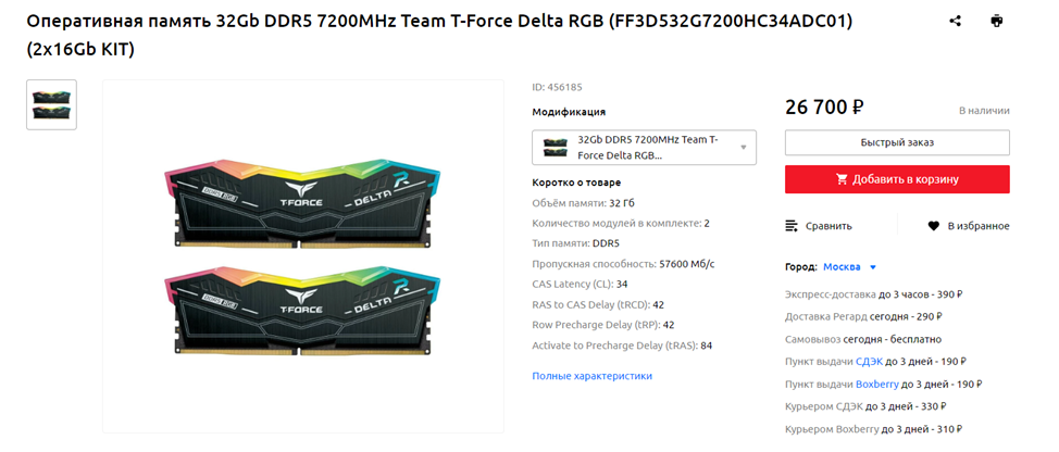 Оперативная память: DDR5-7200 Team T-Force Delta RGB FF3D532G7200HC34ADC01 32 ГБ (Amazon)