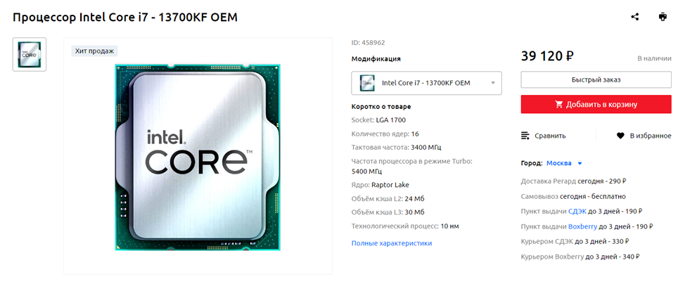 Процессор: Intel Core i7-13700KF OEM (Регард)