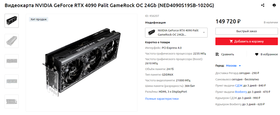Видеокарта: Palit NVIDIA GeForce RTX 4090 GameRock OC (Ozon)