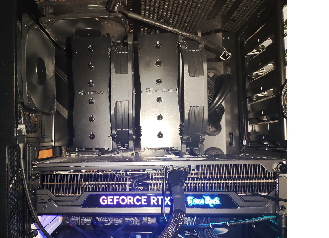 С процессором я определился заранее – обзоры Intel Core i7-13700KF показали, что брать для игр стоит именно его. Что же касается системы охлаждения – я не слишком люблю СЖО, поскольку они более непредсказуемы, чем воздушные кулеры, и чаще требуют внимания и обслуживания. Поэтому, не мудрствуя лукаво, я выбрал надежный и проверенный вариант – Noctua NH-D15 Chromax.Black с комплектом креплений под 1700 сокет. Скажу сразу: в разгоне хотя бы до 5.5 ГГц по P-ядрам он уже не держит «тринадцать тысяч семисотый» в LinX или Prime95. В играх стабильность сохраняется, но я решил зафиксировать частоты на 5.3/4.2 ГГц (Ring 4.5, LLC 4) при относительно невысоком напряжении в 1.35В – производительности и так хватает. Кулер при этом в играх работает достаточно тихо, играет свою роль и шумоизоляция корпуса. Вертушки я ставил обе, но одну слегка приподнял, чтобы влезли модули памяти.