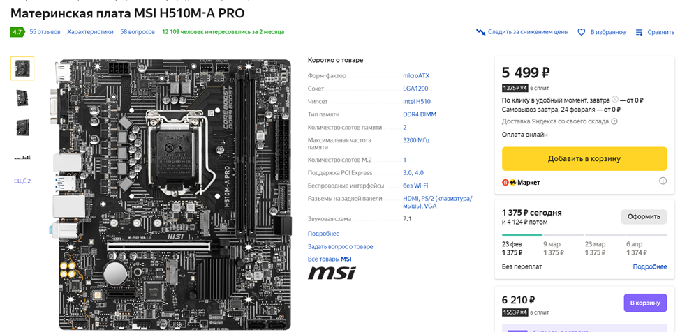 Материнская плата: MSI H510M-A PRO