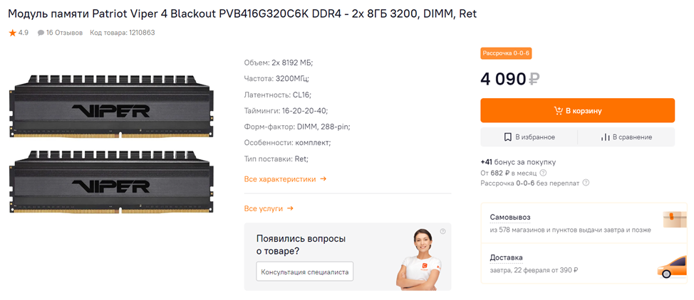 По оперативной памяти рекомендация стандартная для недорогих сборок – 16 гигабайт, причем двумя модулями, чтобы не упускать бесплатную прибавку производительности от двухканального режима. К счастью, ОЗУ сейчас стоит очень дешево – компании, выпускающие для нее чипы, даже специально снижают объемы производства, чтобы не отдавать их за копейки. Смотрите в сторону комплектов с частотой 3000-3200 МГц и таймингами 16-20-20 или 16-18-18. Особенной разницы между такими вариантами вы не заметите, а вот низкочастотной памяти (DDR4-2400 МГц и т.д.) избегайте – стоит она не сильно дешевле, но значительно уступает в производительности. Кстати, оперативку можно купить и на сайтах объявлений – она долговечна и крайне редко выходит из строя. Но мемтест перед покупкой прогнать все равно желательно.