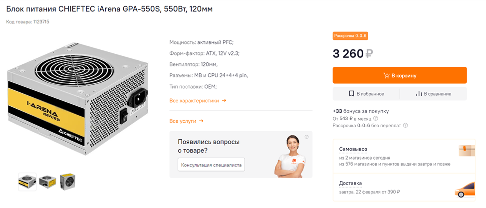 Блоки питания Chieftec бюджетного сегмента для своей цены диво как хороши – они радуют честной мощностью, адекватной стабильностью напряжений, высокой надежностью и малым уровнем шума при средней нагрузке. Именно поэтому я часто рекомендую их в своих сборках, да и сам был обладателем двух разных БП Chieftec, до того, как разжился be Quiet Dark Power Pro 12 на 1200 Вт, а также советовал их многим друзьям и знакомым – никто не жаловался. Для рассматриваемой конфигурации можно взять, к примеру, Chieftec iArena GPA-550S – с учетом не самого высокого энергопотребления выбранного железа, его будет более, чем достаточно – запас мощности сверху будет составлять несколько десятков процентов. Конечно, КПД у бюджетных блоков питания, даже чифтековских, отнюдь не 90-96%, как у премиальных, но не стоит и предъявлять к ним столь строгих требований.