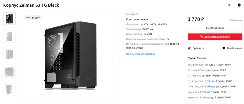 Chieftec для меня – золотой стандарт в начальном сегменте рынка блоков питания, а Zalman – в начальном сегменте рынка Midi Tower корпусов. Выбирая решения других производителей (за редким исключением), вы, скорее всего, столкнетесь с одной из следующих проблем: отсутствие комплектных вентиляторов или наличие всего 1-2 штук, непродуманная конструкция, малое количество свободного места, низкое качество изготовления элементов или очень тонкие стенки. Шасси Zalman тоже нельзя назвать идеальными, недостатки есть и у них, но в своей «весовой категории» они обычно выступают в роли явных фаворитов. Так, корпус Zalman S3 TG, который я выбрал для сегодняшней сборки, можно приобрести менее, чем за 4 тысячи рублей, при этом он достаточно просторный и современный, а еще приятно выглядит и по-умолчанию оснащается аж тремя 120-мм вентиляторами, к которым, при желании, можно добавить еще несколько.