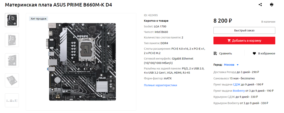 Для Core i5-12400F хорошо подойдет практически любая материнская плата на чипсете Intel B660, но в качестве варианта по-умолчанию предлагаю выбрать ASUS PRIME B660M-K D4. У нее даже есть радиатор, защищающий от перегрева подсистему питания, хотя с выбранными мной CPU, кулером и корпусом необходимости в нем не будет. Гораздо более важное преимущество – наличие двух разъемов для M.2 PCI-Express твердотельных накопителей, поскольку, как показывает мой опыт и опыт моих друзей и знакомых, увлекающихся компьютерными играми, одного SSD со временем начинает не хватать, даже если это двухтерабайтник. Если же используется накопитель на терабайт, или, тем более, на 500 ГБ, то ожидать, что свободного места хватит надолго, не приходится.