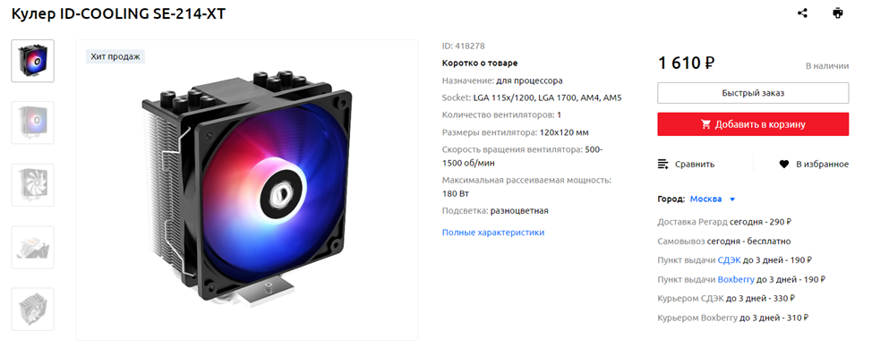 ID-COOLING SE-214-XT – один из лучших башенных кулеров в ценовой категории «около 1500 рублей» – он способен справиться и с ощутимо более горячими процессорами, нежели «двенадцать тысяч четырехсотый» – может, насчет 180 Вт производитель несколько преувеличил, но не сильно. Состоит система охлаждения из средних размеров радиатора с четырьмя тепловыми трубками и тихого, но эффективного 120-миллиметрового вентилятора. Вообще, на рынке достаточно много подобных кулеров, но большинство из них содержат те или иные конструктивные просчеты, из-за которых они не так хорошо отводят от процессора тепло, как рассматриваемая модель. Что же касается продукции компании ID-COOLING в целом – она часто является оптимальной по соотношению стоимости и характеристик, за что заслуженно любима компьютерщиками и геймерами.