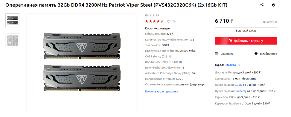 Оперативной памяти в конфигурацию за 100 тысяч рублей крайне желательно сразу установить 32 гигабайта, чтобы в дальнейшем не приходилось докупать дополнительные модули. Требуемый же объем, как обычно, следует набирать двумя планками ради активации двухканального режима, существенно повышающего производительность подсистемы памяти. Комплект из пары шестнадцатигигабайтных модулей Patriot Viper Steel стоит меньше 7 тысяч рублей – с учетом того, что такого объема хватит на весь жизненный цикл рассматриваемой сборки, цена просто смешная. Да и характеристики у предлагаемой мной памяти приличные – частота 3200 МГц и тайминги 16-18-18 давно стали для бюджетных и среднебюджетных конфигураций «золотым стандартом».