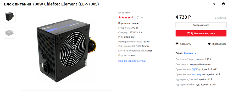 Блок питания, как обычно, советую взять с запасом по мощности – отлично подойдет, например, 700-ваттная модель Chieftec Element ELP-700S. «Честных» Ватт по линии 12В здесь 648, но и этого более, чем достаточно для нашей конфигурации, а еще БП тайваньского бренда, как правило, достаточно надежны и беспроблемны, а также оснащаются качественными для бюджетного сегмента вентиляторами, не создающими лишнего шума. Гнаться же за высоким КПД, отстегивающимися кабелями, ARGB-подсветкой и другими «фишечками» дорогих моделей, когда бюджет на всю сборку составляет около 100 тысяч рублей, я не советую – лучше вложить дополнительные средства в те компоненты системы, что напрямую влияют на производительность. При этом чрезмерно экономить на БП тоже не стоит – китайские Noname-модели покупать просто-напросто опасно. Они могут быстро выйти из строя и унести за собой часть остального железа.
