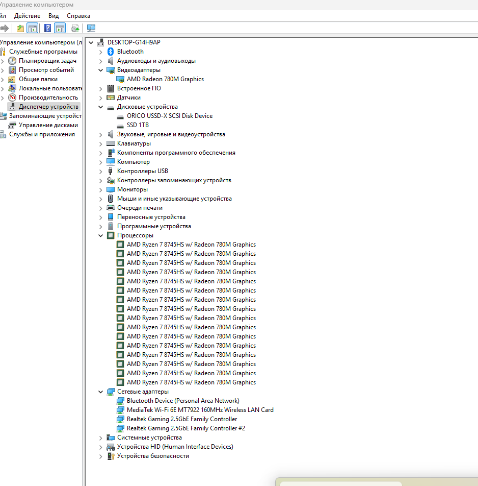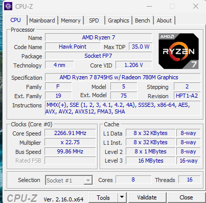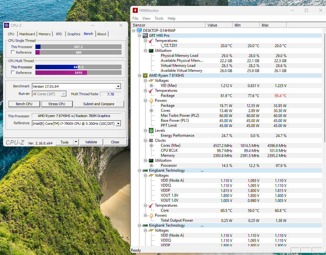 Бенчмарк от CPU-Z в стресс тесте разогнал процессор почти на 100 % возможностей и температура процессора достигла 95 С. Программа показала соответствие железа заявленному. Процессор AMD Ryzen 7 8745HS с графикой Radeon 780M, оперативная память формата SO-DIMM поколения DDR5 и накопитель на 1TB.