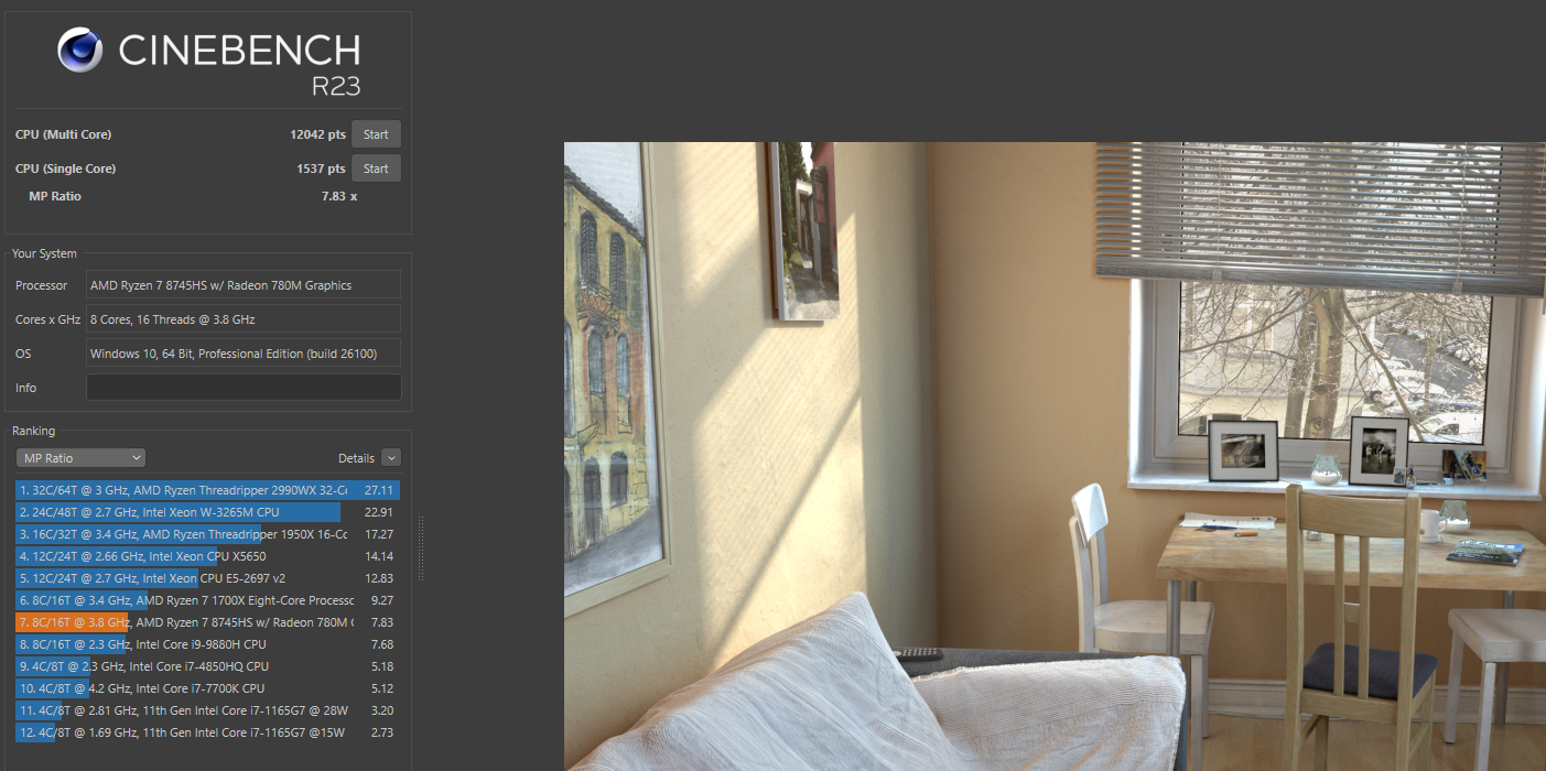 Сразу приступим к тестам всякими разными бенчмарками, чтобы было наглядно сравнение возможностей этого ПК с другими моделями. 3D-mark подарил 6631 балл в тестах, GeckBench выдал 10456 баллов в мультипотоковом тесте, а Cinebench R23 показал 12042 на всех ядрах. А значит мы можем надеяться на вполне неплохие результаты во время игр.