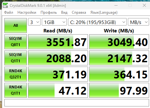 Хочется проверить еще возможности установленного SSD накопителя. Как и следовало ожидать, тут установлен довольно бюджетный накопитель со скоростями 3550 МБ/с на чтение и 3050 МБ/с на запись.