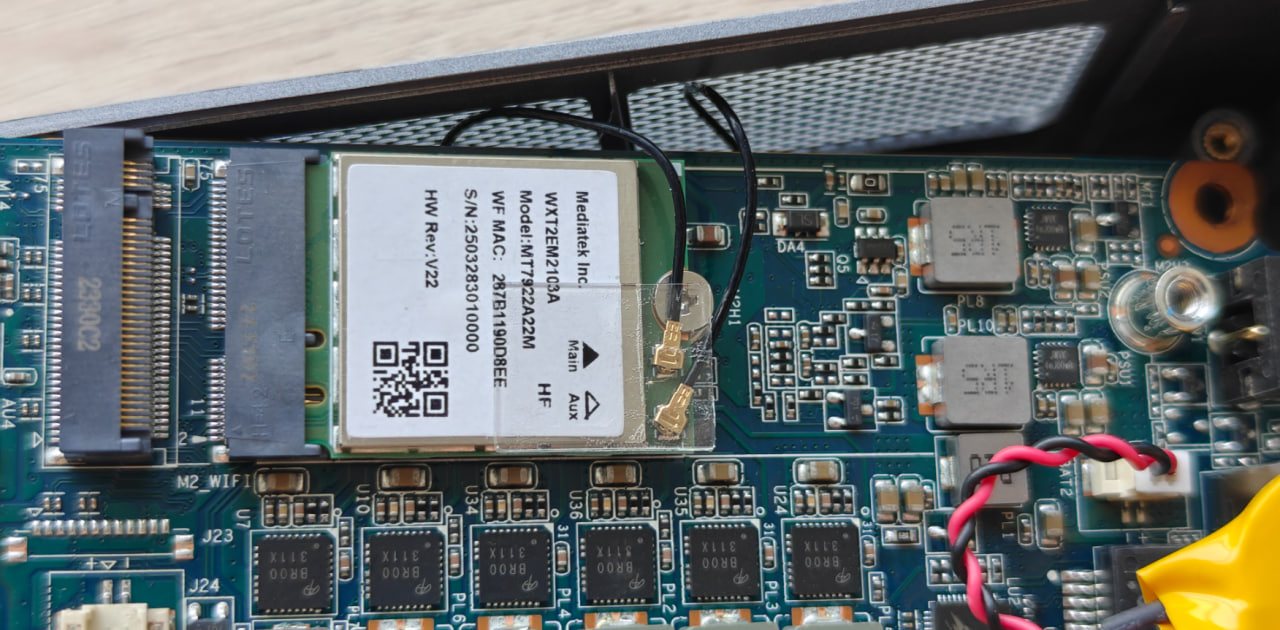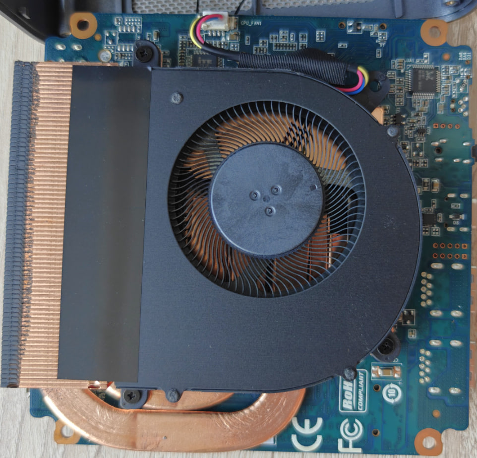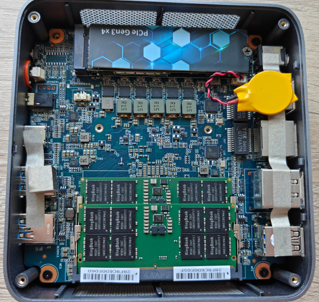 После таких данных хочется посмотреть вживую на железо. Откручиваем четыре винта снизу и снимаем крышку. Внутри классическая одноплатная система и большой кулер на процессоре. Понравилось то, что накопитель и оперативку можно поменять, SSD от неизвестного производителя на 1TB, две планки оперативки KingBank по 16ГБ формата SO-DIMM. Классно бы было если б поставили одну планку на 32 ГБ и свободный слот, тогда можно было бы более дешево апгрейдить ПК, но это так... придирки. Под накопителем установлен сетевой чип от Mediateck и есть еще звуковая плата от Realtek.