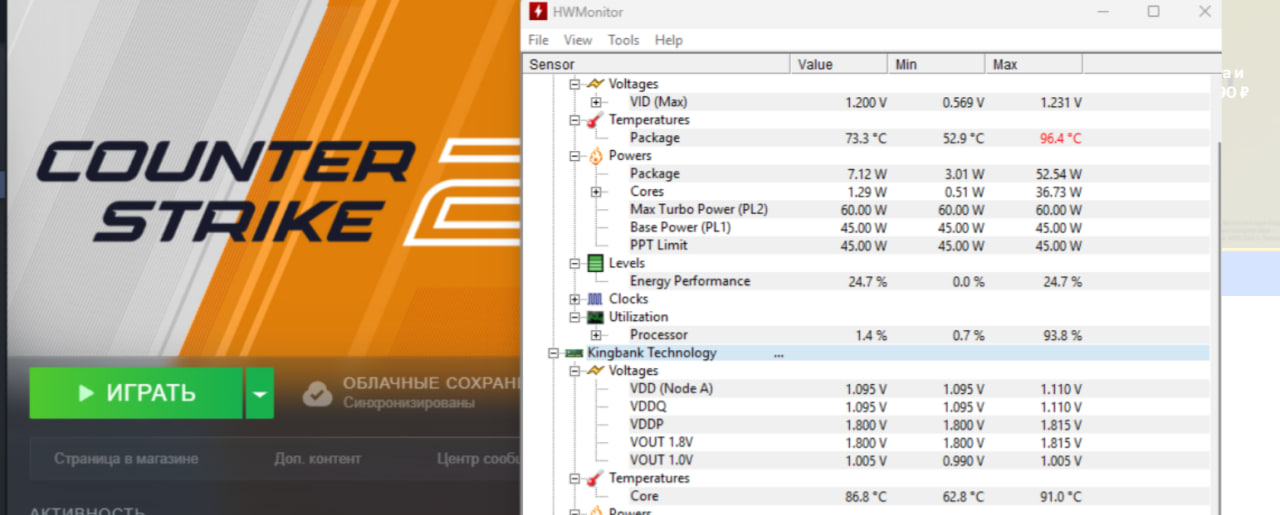 В популярный шутер Cointer Strike 2 можно играть на высоких настройках при разрешении 1920х1080, машинка стабильно выдает 40 FPS. Если снизить настройки на средние, тогда FPS возрастает до 140 при падении до 100 на самых активных зарубах. Максимально процессор разогрелся до 94С.