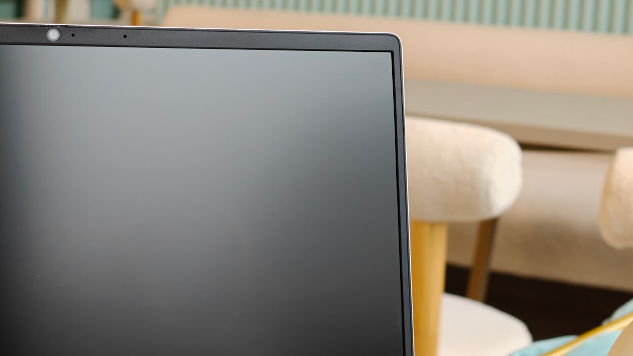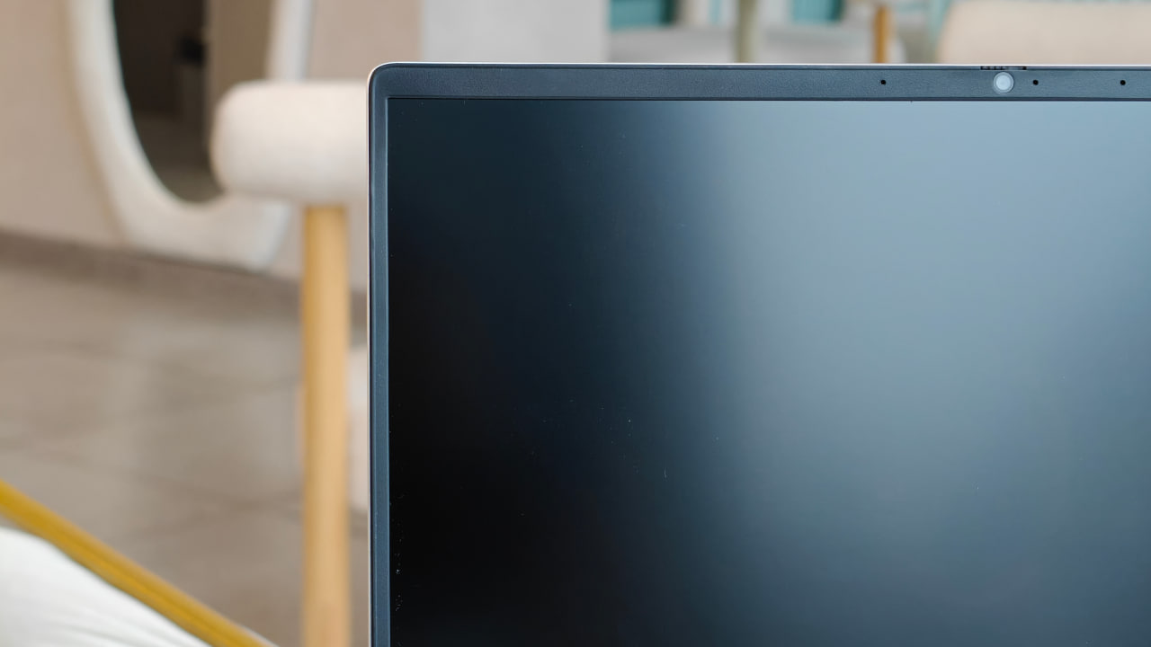 Открывается ноутбук излюбленным движением владельцев "маков", а именно одной рукой. Экран на 14" окружен небольшими рамками со встроенной по центру верхней грани селфи-камерой под физической шторкой. Рядом с камерой расположен диод индикации ведущейся съемки и микрофон. Рамки слева и справа совсем тонюсенькие.