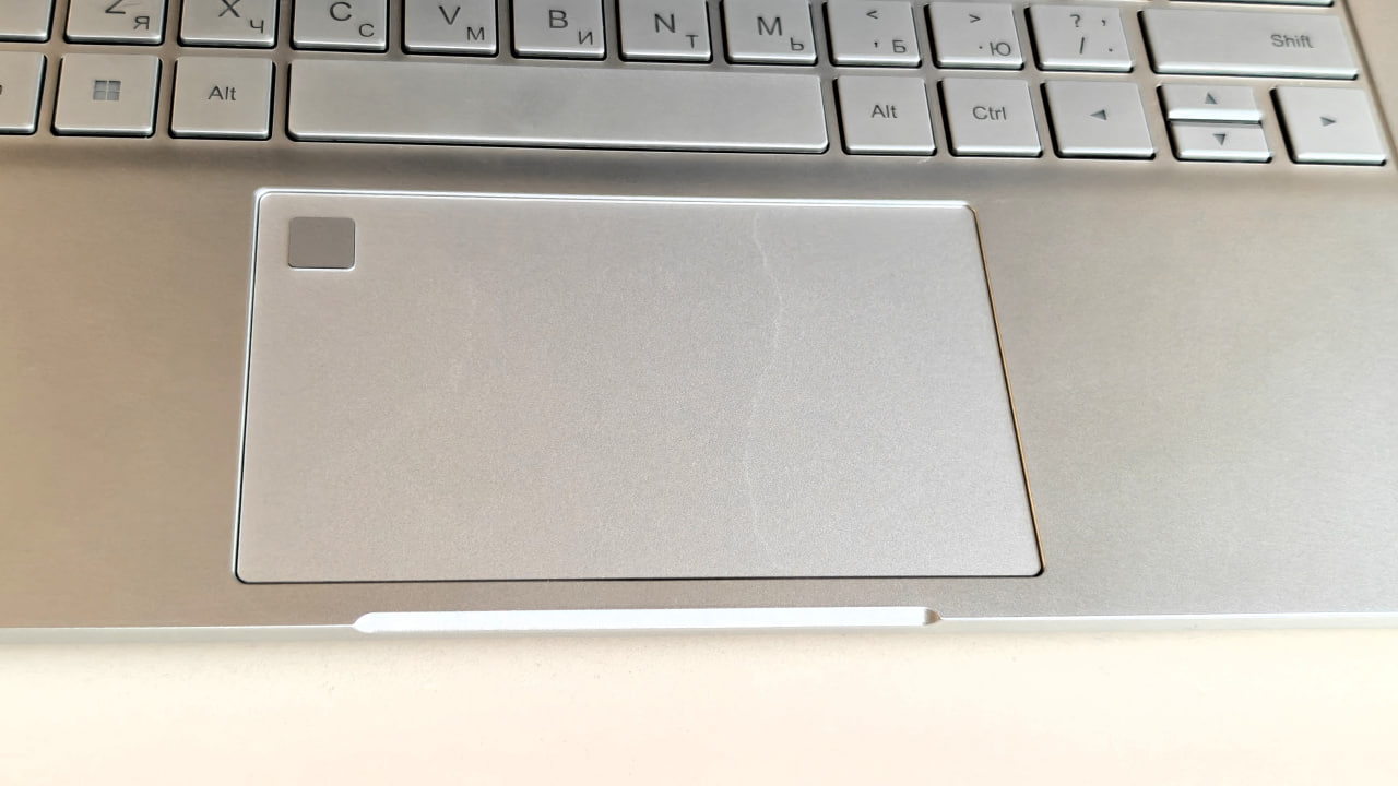 Отдельно справа верху расположена кнопка питания. То же могу сказать и про тачпад, он действительно крупный, чтобы удобно было работать без мыши. Слева сверху тачпада расположен хороший вменяемый датчик отпечатков пальцев. Со слезами вспоминаю датчик в моем рабочем "Леново", где он был поставлен чисто для красоты. Тут датчик хорошо работает и позволяет разблокировать Windows быстрым нажатием, а не вводом пин-кода.