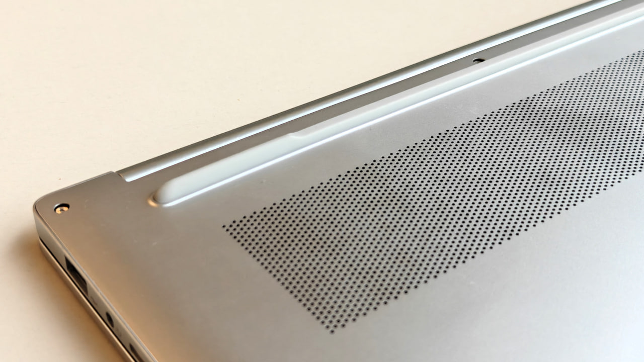 Нижняя крышка ноутбука из металла. На ней расположились перфорация охлаждения процессора и отверстия динамиков по двум сторонам.