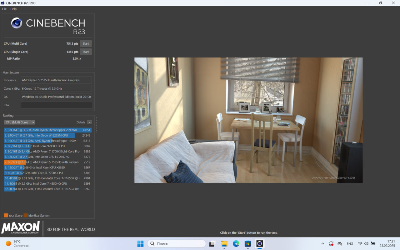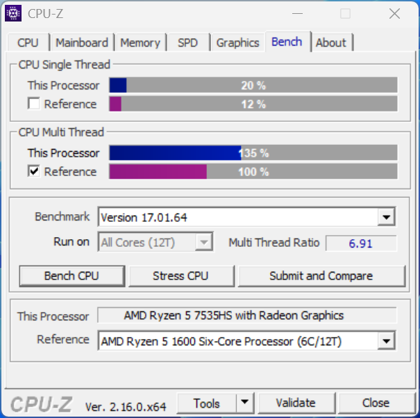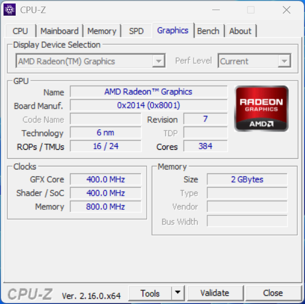 Открываем приложение CPU-Z, в нем убеждаемся, что используется процессор AMD Ryzen 5 7535H, оперативная память стандарта LPDDR5 на 16GB, материнская плата стандарта PCI-Express 4.0 и встроенная графика от AMD.