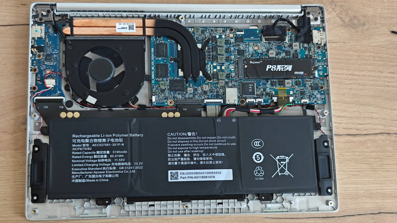 Все же, посмотрим, что у него внутри... Откручиваем винты и видим небольшую материнскую плату с тонким кулером и медными трубками охлаждения. Отметим неизвестного производителя SSD накопителя и распаянную оперативную память от фирмы Rayson. За беспроводные интерфейсы и звук использованы именитые бренды чипов. Да и аккумулятор не подвел 5195 mAh и 60 Wh.