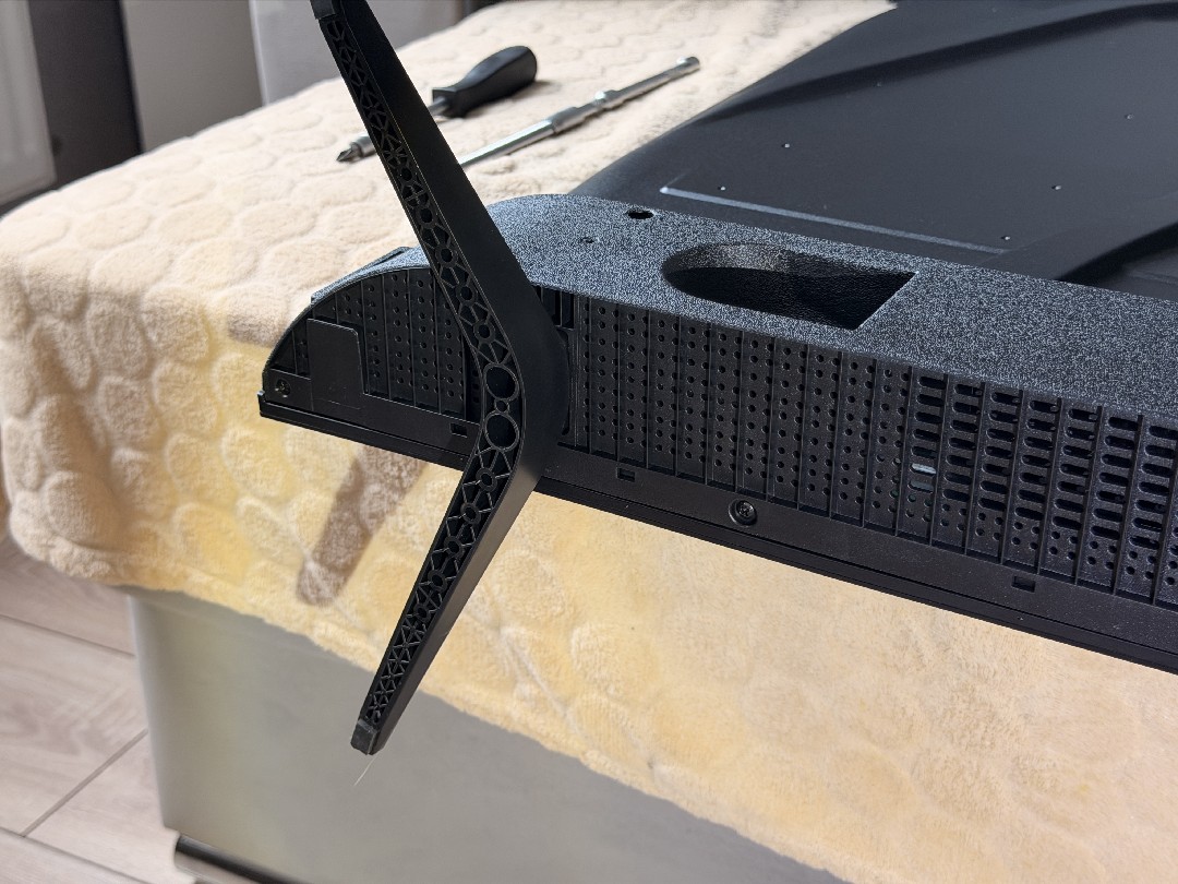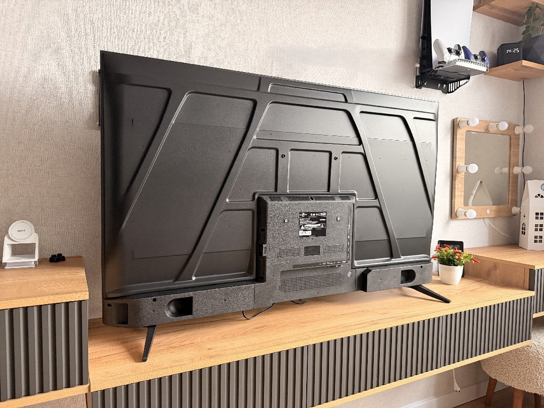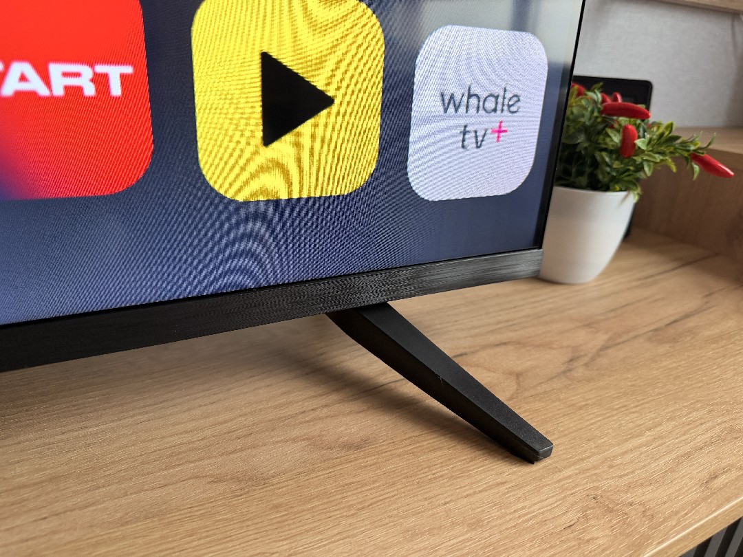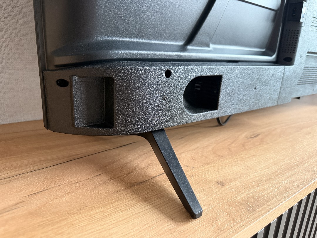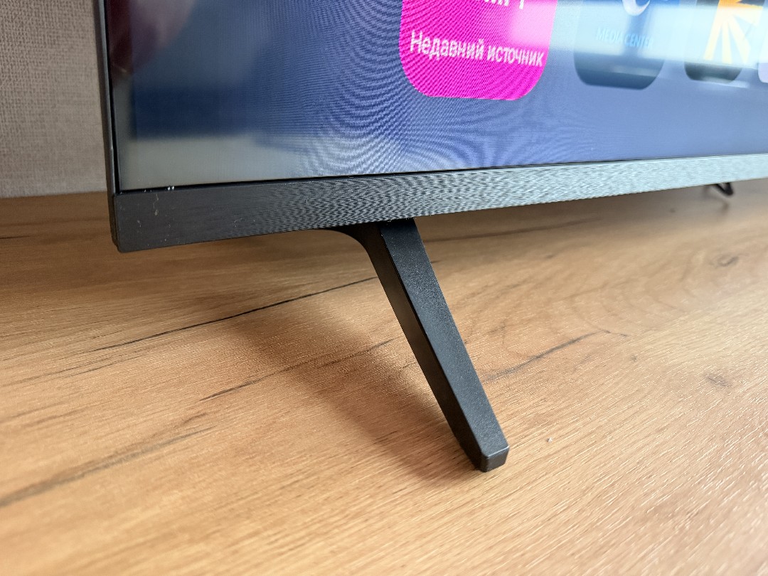 Рамки совсем тонкие, но присутствует черная полоска в самом дисплее, порядка 4 миллиметров. По центру полоски под экраном нанесено название бренда. Комплектные пластиковые ножки расставлены широко. ТВ стоит устойчиво и не скользит (снизу резинки).