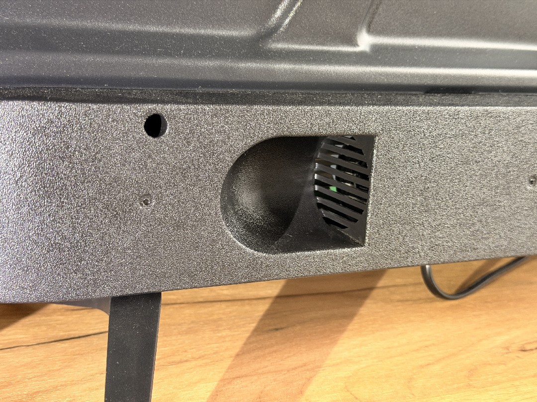 Если присмотримся, то заметим, что динамики направлены не вниз, а в стороны, что должно помочь создать дополнительный объем в звучании, динамики круглые, мощность каждого 10 Ватт. По центру все данные модели на наклейке, невооруженным взглядом видим крепления для кронштейна на стену 200 х 200 мм.