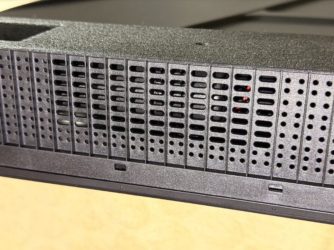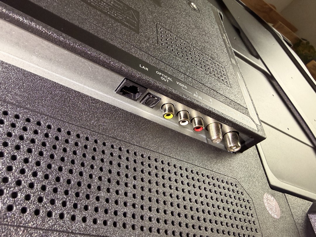 Нижний торец значительно толще верхнего. Сверху телевизор совсем плоский, а внизу мы увидим отверстия для вентиляции, места крепления ножек, и корпус светоотражателя светодиодного индикатора питания и фотоприемника сигналов пульта. На этой слегка выпирающей платформе расположилась и кнопка питания.