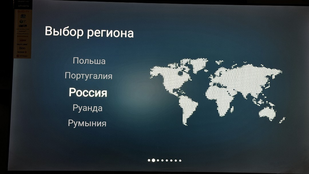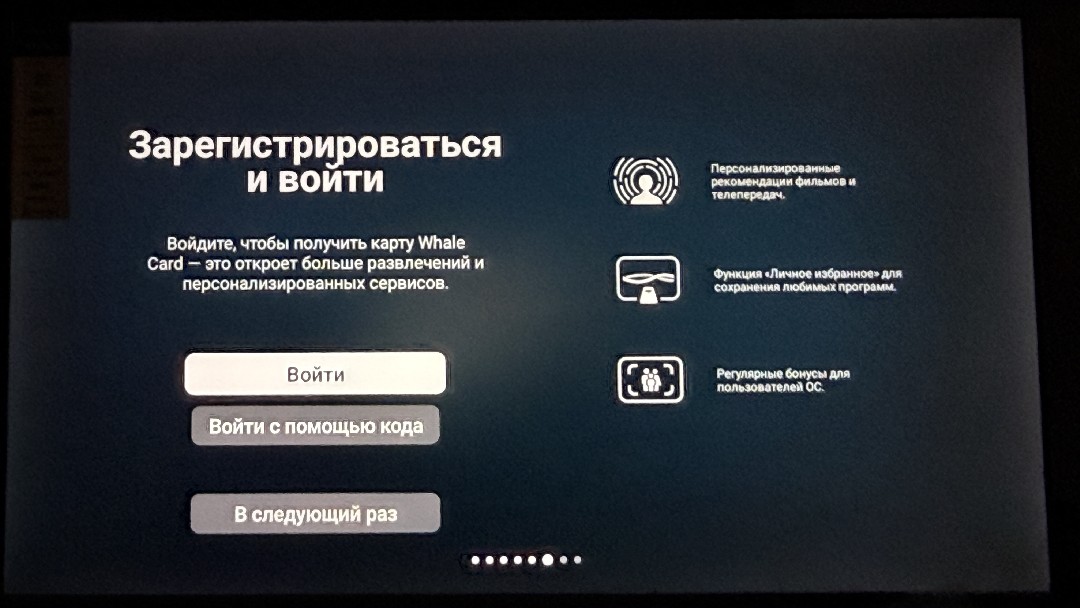 После первого запуска нам предлагают пройти первые шаги настройки оболочки Whale OS. Тут все банально, выбираем регион, подключаем пульт, подключаемся к интернету посредством Wi-Fi или проводом, и если хотим, проходим процедуру регистрации в сервисе Whale TV.