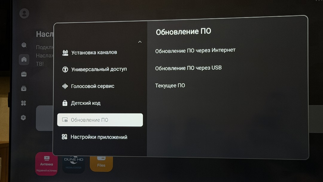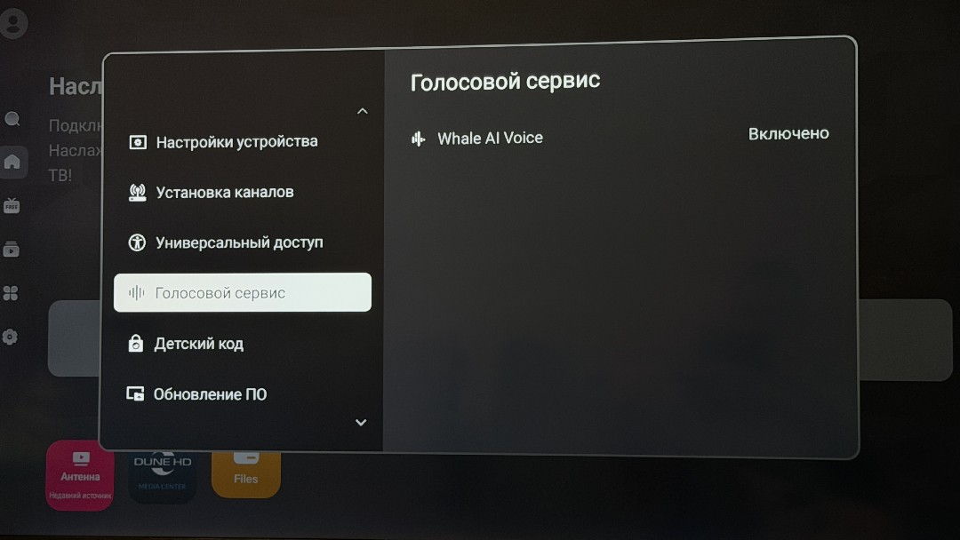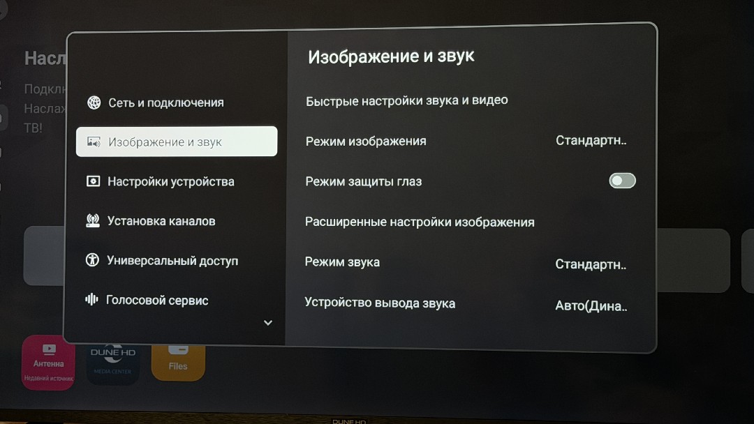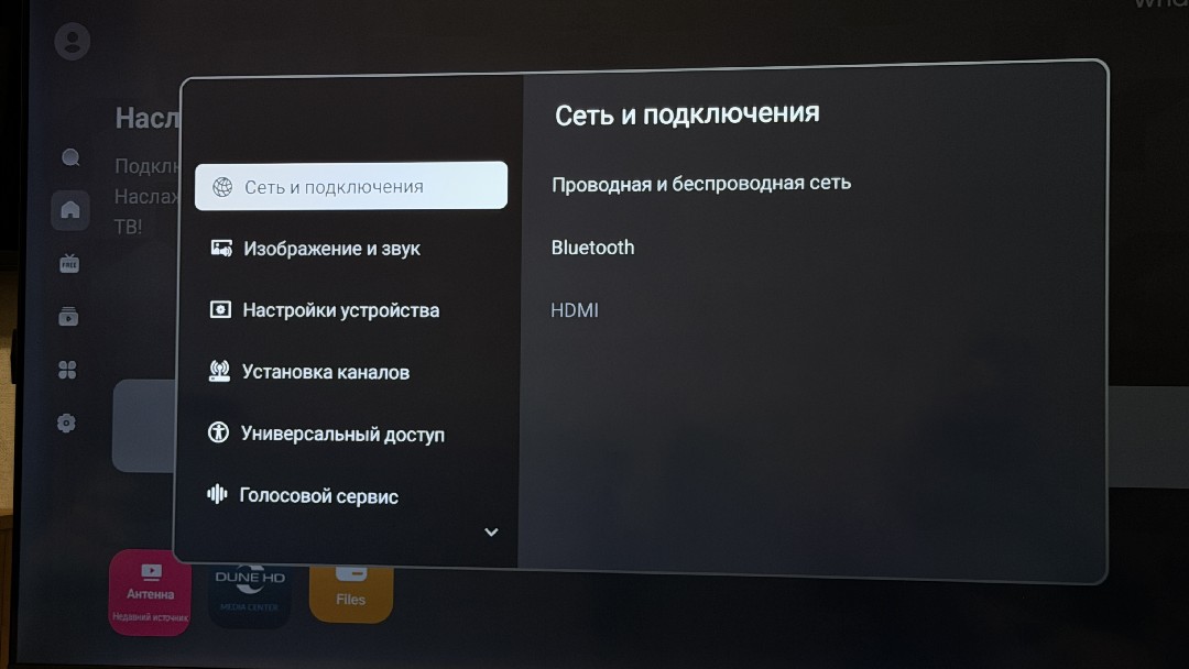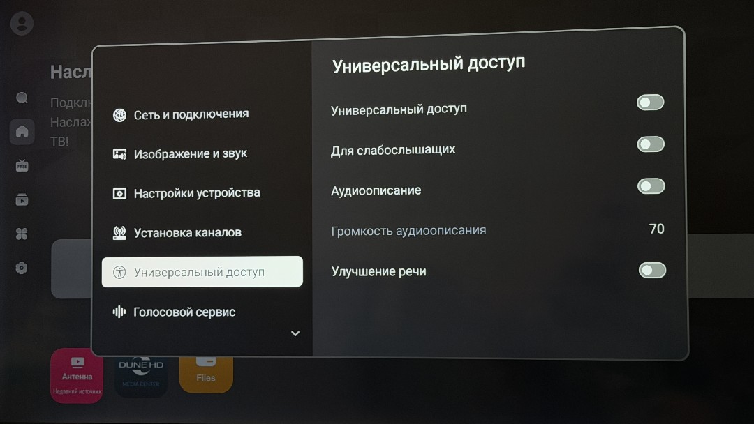 По клику влево открывается дополнительный статус-бар с поисковой строкой, главной страницей, бесплатным ТВ, обзором рекомендаций и приложений, установленных на телевизоре. Далее следуют основные настройки, выбор источников сигнала, с настройками телевидения через антенну. Настроек не большое количество, тут и коррекция изображения, включая поэтапную регулировку подсветки, яркости, насыщенности, контраста и других параметров. В настройках найдем и регулировку звука, включая выбор стандартов объемного звучания Dolby, и опции вывода звука через оптику и HDMI. Также можем обновлять ПО телевизора, как вручную с флешки, так и по воздуху, управлять приложениями, как привыкли в Андроиде, искать ТВ каналы по кабелю и с тарелки, есть универсальный доступ для увеличения полезности использования. Также активируем голосовой сервис, о котором я расскажу чуть ниже.