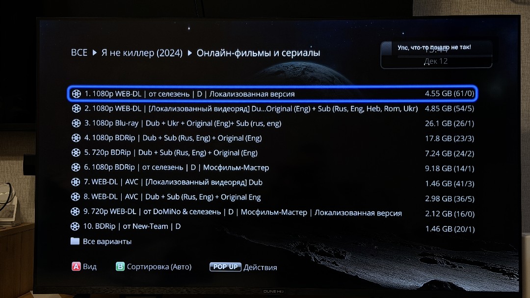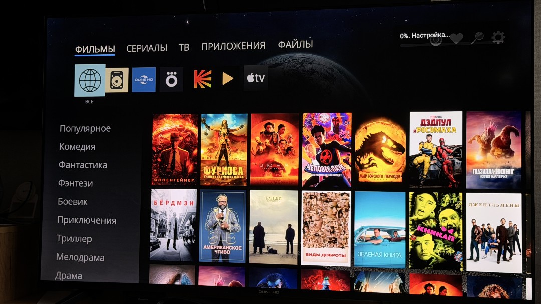 Если нам мало контента из всех предустановленных сервисов на ТВ, запускаем Dune HD медиаплеер. При помощи этого многофункционального центра мы можем просмотреть любой контент. Можно смотреть любые рипы и образа дисков с подключаемого накопителя по USB, можем смотреть из облака или из Samba сервера. Само приложение дает возможность доустановить еще много дополнительных приложений, включая установку из APK и с флешки, и с облака. Есть возможность использовать встроенный ТВ сервис (нужна подписка), слушать онлайн радио, делать скриншоты экрана через специальное ПО, разбирать весь ваш контент по собственным библиотекам, чтобы доступ к вашей коллекции был прост и понятен именно вам. В дополнение ко всему есть много разнообразных вариантов сервисов, которые предоставляют весь современный контент за подписку. Их рекламировать я не стану, и подобные сервисы не поощряю, но возможность их использования есть из коробки. Любопытно, что мы можем поставить даже Rustore прям из плеера, чтобы в дальнейшем качать программы оттуда. К примеру, я скачал Смотрешку, которая дает большой выбор сериалов Амедиатеки. И мне не потребовалось ни подключаться к облаку, ни копировать приложения на флешку, все есть сразу, что называется "из коробки".