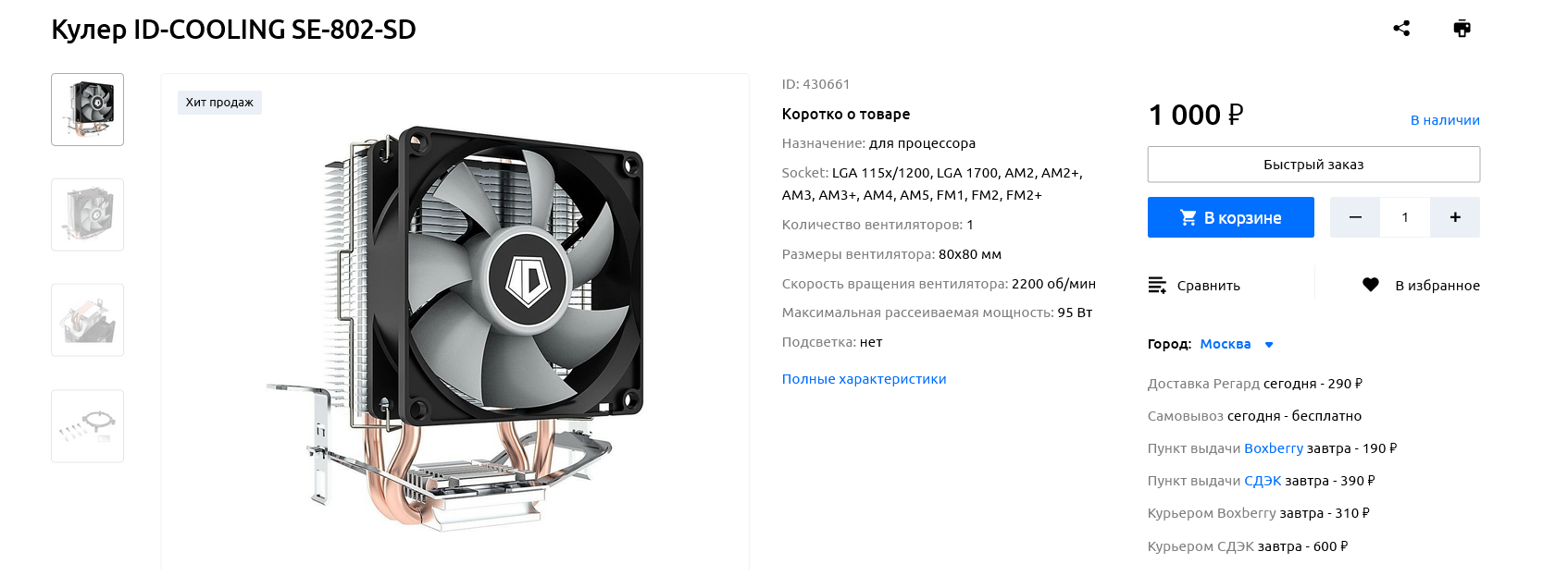 Я еще помню те времена, когда бюджетные кулеры с теплотрубками можно было купить за 600 рублей, потом их цена поднялась до 800 рублей и вот сегодня я нашел самый бюджетный кулер такого типа, ID-COOLING SE-802-SD, уже за 1000 рублей. Это новая ценовая реальность и, если вы не готовы покупать кулеры по таким ценам, стоит искать их на вторичном рынке — ведь это такой компонент, ломаться в котором нечему, кроме вентилятора, который легко заменить. ID-COOLING SE-802-SD может отвести от процессора до 95 ватт и его вполне хватит для нашего не особо горячего Ryzen 5 5500, тем более, что мы делаем сборку для игр, а не для разгона.