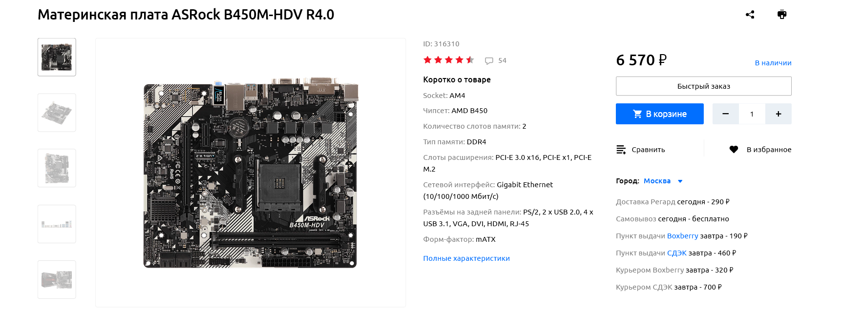 Выросли в цене и материнские платы. Даже недорогие модели на чипсете AMD B450 стартуют теперь с цены в 6570 рублей за ASRock B450M-HDV R4.0. И за эту цену не стоит рассчитывать на радиаторы на системе питания, они потребует доплаты еще почти в 2000 рублей, что довольно чувствительно для бюджетных сборок. Но небольшое энергопотребление Ryzen 5 5500 вполне позволит использовать его на недорогой материнской плате, главное — позаботиться о хорошей вентиляции в корпусе. В остальном ASRock B450M-HDV R4.0 — добротная бюджетная плата со слотом M.2 и необходимым количеством портов расширений, выделяющаяся на фоне остальных бюджетных плат с аналогичной ценой двухцветным дизайном текстолита.