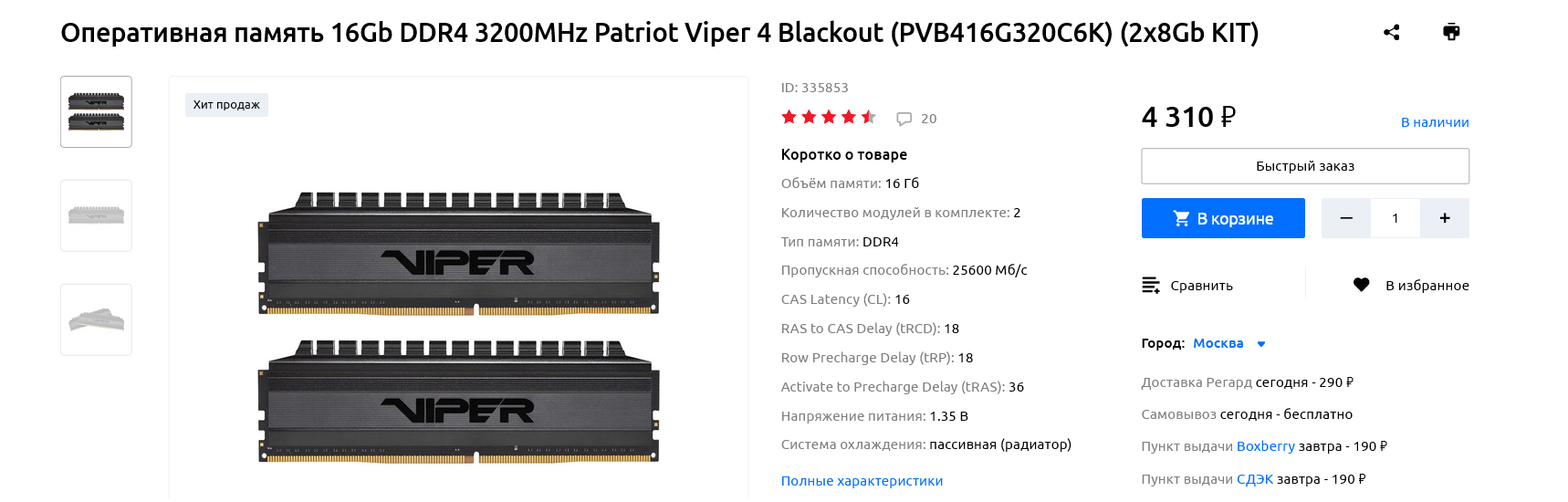Подорожала и оперативная память стандарта DDR4, и теперь от такой роскоши, как установка 32 ГБ ОЗУ в бюджетные сборки, придется отказаться. Неплохие комплекты DDR4 с частотой 3200 МГц можно найти уже за 4000 рублей, но очень важно обращать внимание на формулу таймингов, ведь разница между модулями с таймингом CL 20 и с CL 16 — очень заметна в играх при совсем небольшой разнице в цене. Мы возьмем комплект из двух модулей Patriot Viper 4 Blackout (PVB416G320C6K) общим объемом 16 ГБ, с частотой 3200 МГц и формулой таймингов 16-18-18-36. На модулях установлены эффективные радиаторы, а их разгон поможет поднять производительность системы в играх практически бесплатно и без повышения тепловыделения.