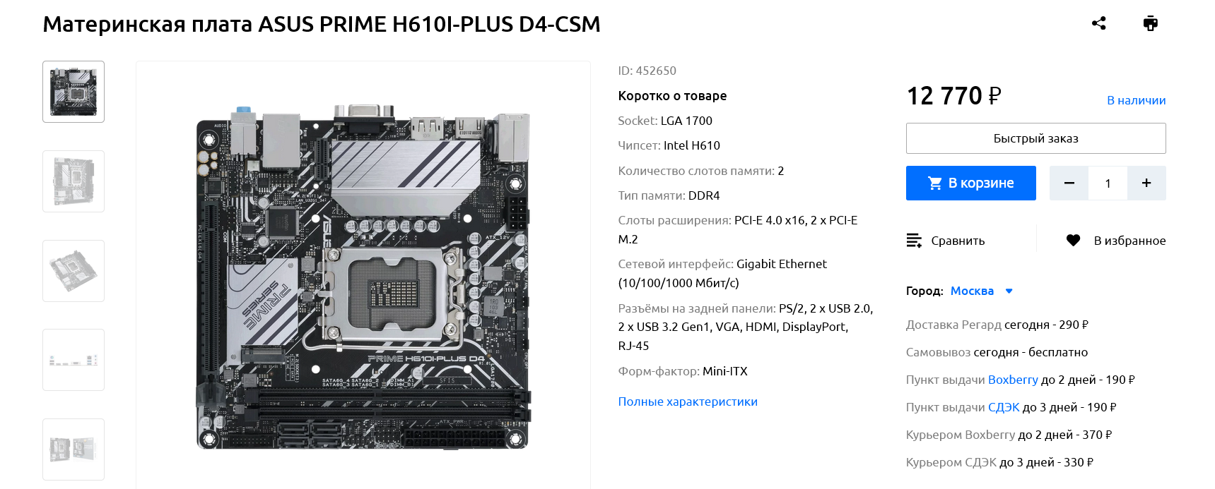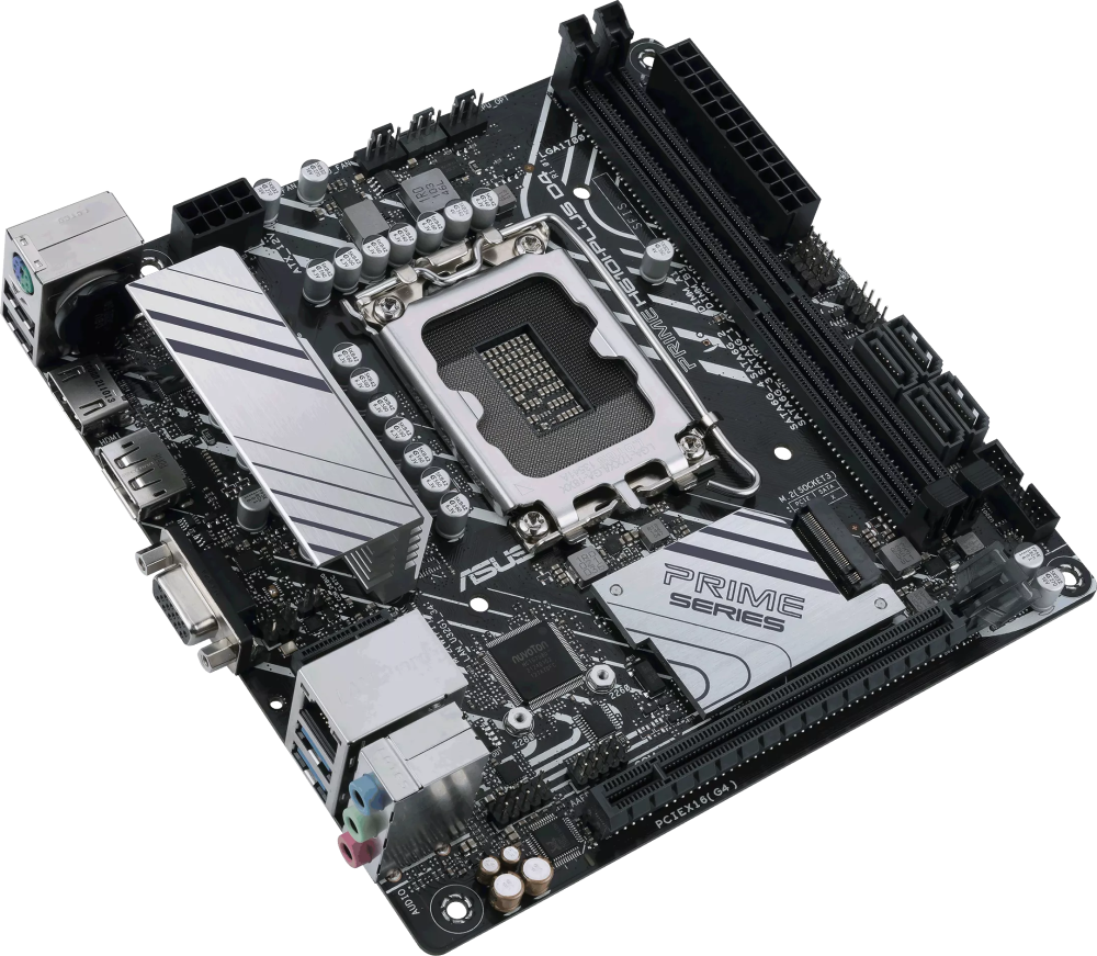 Второй по важности компонент компьютера на платформе Mini-ITX — материнская плата. Выбор Mini-ITX плат хоть и шире, чем выбор корпусов, но тоже небольшой. А нам от платы нужна не только компактность, но и качественное охлаждение цепей питания и возможность поддержки достаточно мощных процессоров, как минимум, с шестью ядрами. Мы возьмем в этот ПК плату ASUS PRIME H610I-PLUS D4-CSM на чипсете Intel H610.