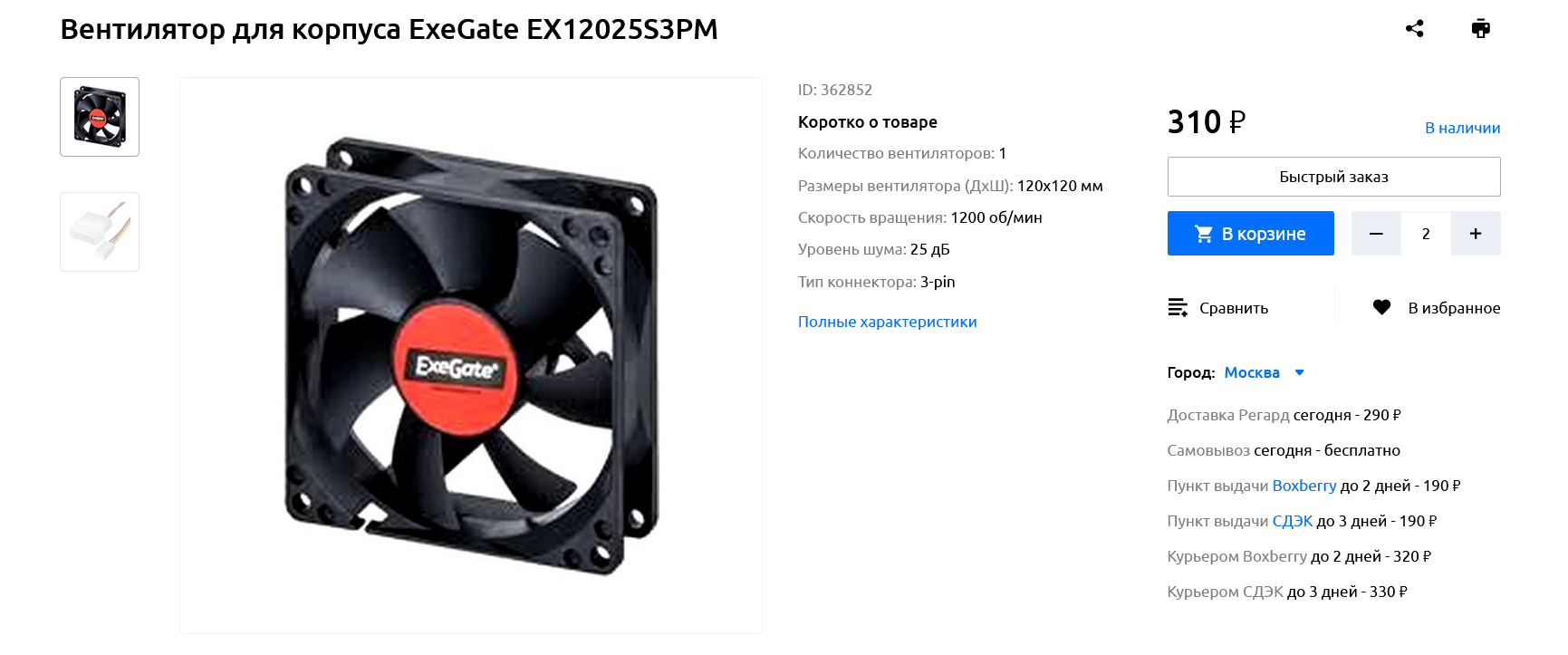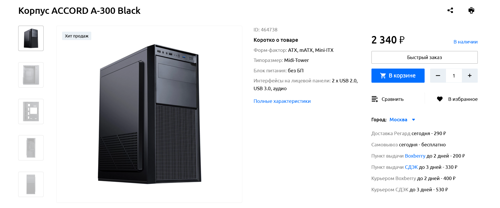 Перерыв весь ассортимент корпусов в Регарде я нашел самый недорогой корпус, ACCORD A-300 Black, из рассчитанных на установку вентиляторов 120 мм, которых можно установить аж четыре штуки — один на выдув, и три на передней панели. За это, а еще учитывая наличие USB 3.0 разъема и низкую цену, ему можно простить консервативный внешний вид, ведь самый дешевый корпус с нижним расположением блока питания в Регарде будет стоить уже почти 3000 рублей.