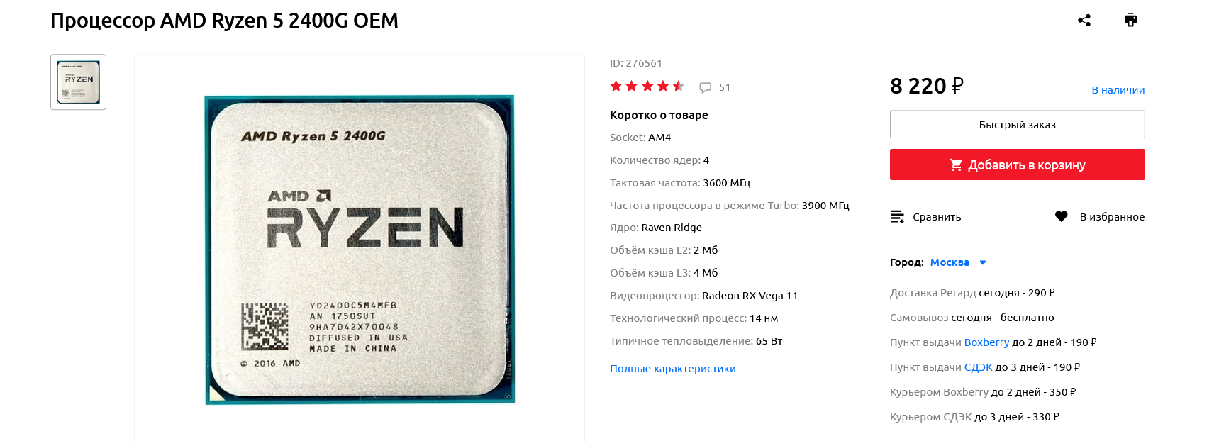Ryzen 5 2400G — довольно старый процессор на архитектуре Zen, вышедший еще в 2018 году и в 2023 году у него все еще есть один козырь в рукаве, ради которого стоит присмотреться к этой модели. Это мощная встроенная графика Radeon Vega 11, которой с лихвой хватает для многих онлайн игр, например, World of Tanks. И если список ваших игр ограничен нетребовательными проектами, а еще вы используете ПК для общения, серфинга интернета и просмотра фильмов, можно смело собирать его на Ryzen 5 2400G. Четыре ядра и восемь потоков еще долго будут актуальны в таких задачах, несмотря на устаревшую архитектуру.