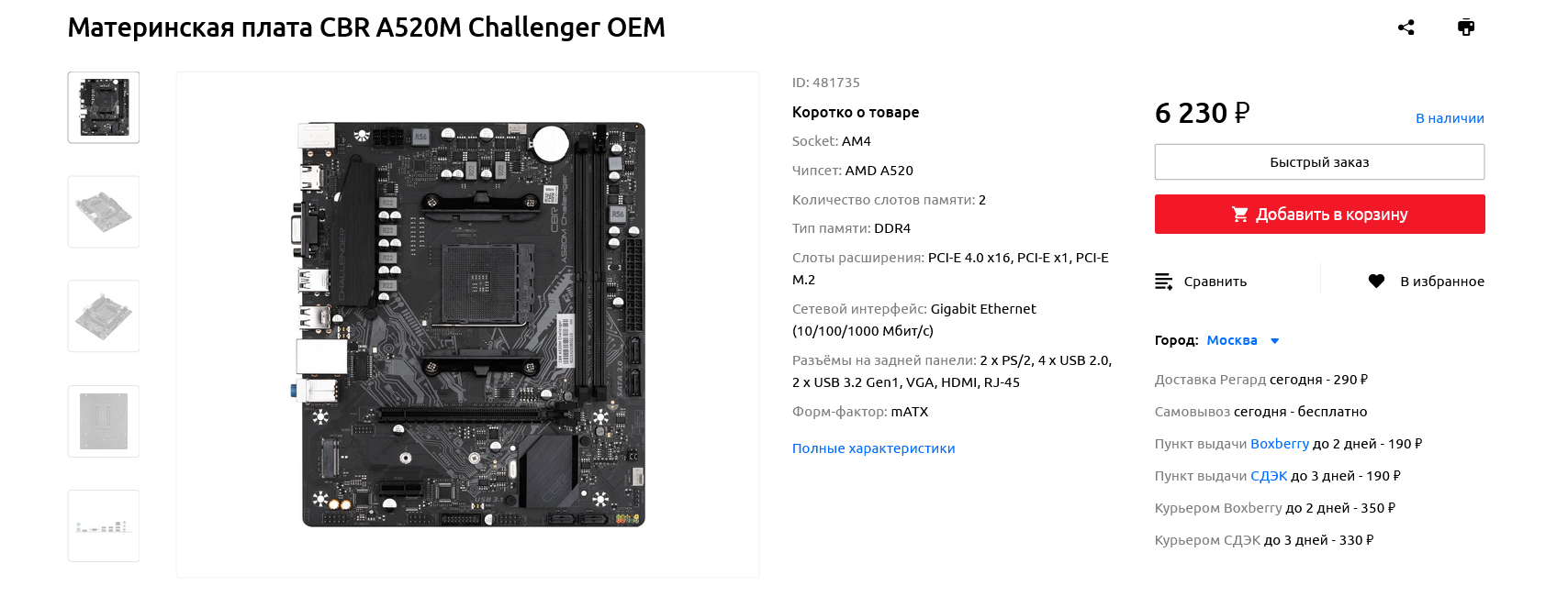 Но есть у Ryzen 5 3600 и минус, который заставит крепко задуматься при выборе между ним и Ryzen 5 5500, даже несмотря на более низкую цену. Это более высокое энергопотребление, ограниченное 88 ваттами. Поэтому для этого процессора стоит выбирать материнскую плату с системой питания, оснащенной радиаторами. Самой недорогой подобной платой в Регарде стала CBR A520M Challenger на чипсете AMD A520. Это бюджетная модель, которая имеет все, что нужно в недорогом игровом ПК — слот M.2, четыре порта SATA и гигабитную сетевую карту.
