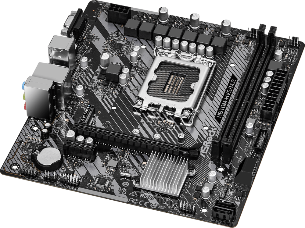 На материнской плате для экономичного Core i3-12100F можно заметно сэкономить, ведь ему хватит недорогой модели на чипсете Intel H610, такой, как ASRock H610M-HVS/M.2 R2.0. Главный плюс бюджетных плат сокета LGA 1700 по сравнению с платами от AMD за ту же цену — поддержка шины PCI Express 4.0, которая очень необходима видеокартам Radeon RX 6500 XT, где разведены всего четыре линии PCI-e. Да и видеокартам Radeon RX 6600 и GeForce RTX 4060 это не помешает, ведь в некоторых играх падение FPS на PCI Express 3.0 может достигать десятка процентов. А в остальном ASRock H610M-HVS/M.2 R2.0 — типичная бюджетная плата, но система питания у нее неплохая, хоть и не накрыта радиатором.