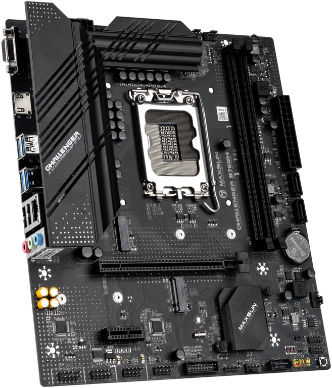 Чтобы Core i5-12400F работал с максимальной отдачей, нужна материнская плата с системой питания, которая легко справится с его энергопотреблением, которое заметно выше, чем у Ryzen 5 5600. А вдобавок позволит в будущем произвести апгрейд на более прожорливый Core i5-12600KF. В Регарде нашлась такая плата по цене даже меньше 10000 рублей, это Maxsun Challenger B760M на свежем чипсете Intel B760 и огромными радиаторами на 10-ти фазной системе питания. На остальном при создании этой платы сэкономили, даже количество портов SATA — всего три штуки, но зато более актуальных и востребованных портов M.2 распаяли пару штук.