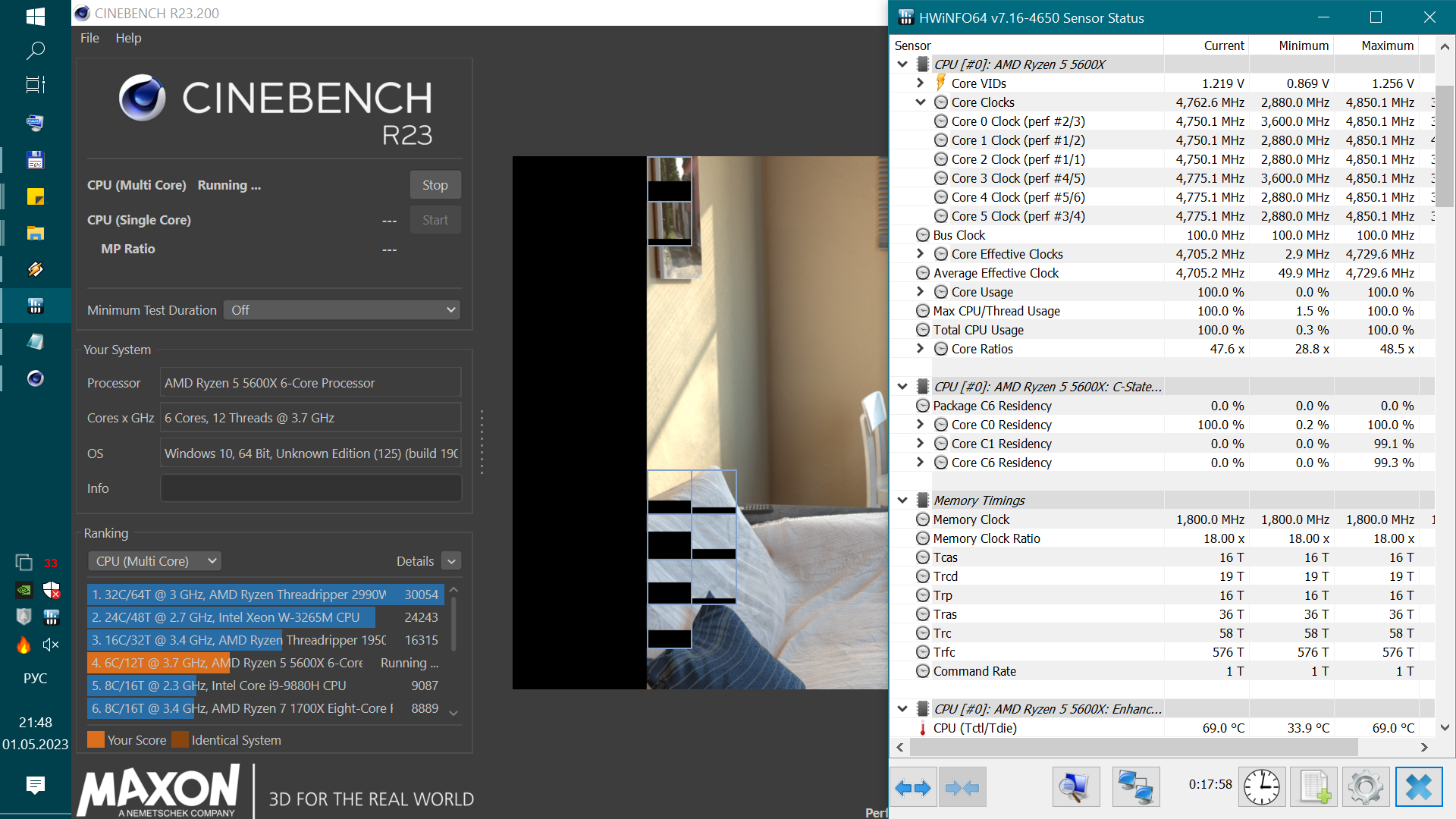 Ryzen 5 5600X оказался гораздо скучнее в плане разгона. Мне опять попался удачный экземпляр, способный работать на частоте +200 МГц, с Curve Optimizer или "курвой", выкрученной на самый минимум, что дало возможность проходить тяжелые тесты типа Cinebench R23 с частотой выше 4700 МГц и очень небольшом напряжении, ниже 1.26В.
