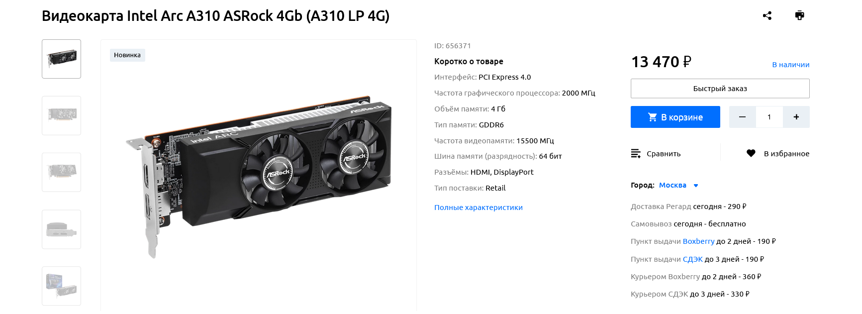 Главный вопрос сборки — какую видеокарту в нее выбрать? Я давно присматриваюсь к моделям от Intel, которые стоят очень дешево из-за низкой производительности, которую показывали на старте продаж. Но драйвера постепенно подтягивают их результаты в играх и Intel Arc становятся все более привлекательны в разных ценовых сегментах. Например, Intel Arc A310 от ASRock стоит дешевле любой версии GeForce GTX 1630, показывая схожую производительность во многих играх. Ну а о таких вещах, как ускорение видео высокой четкости, или подспорье процессору в программах обработки графики даже не стоит говорить — это само собой разумеющееся дело в 2024 году.