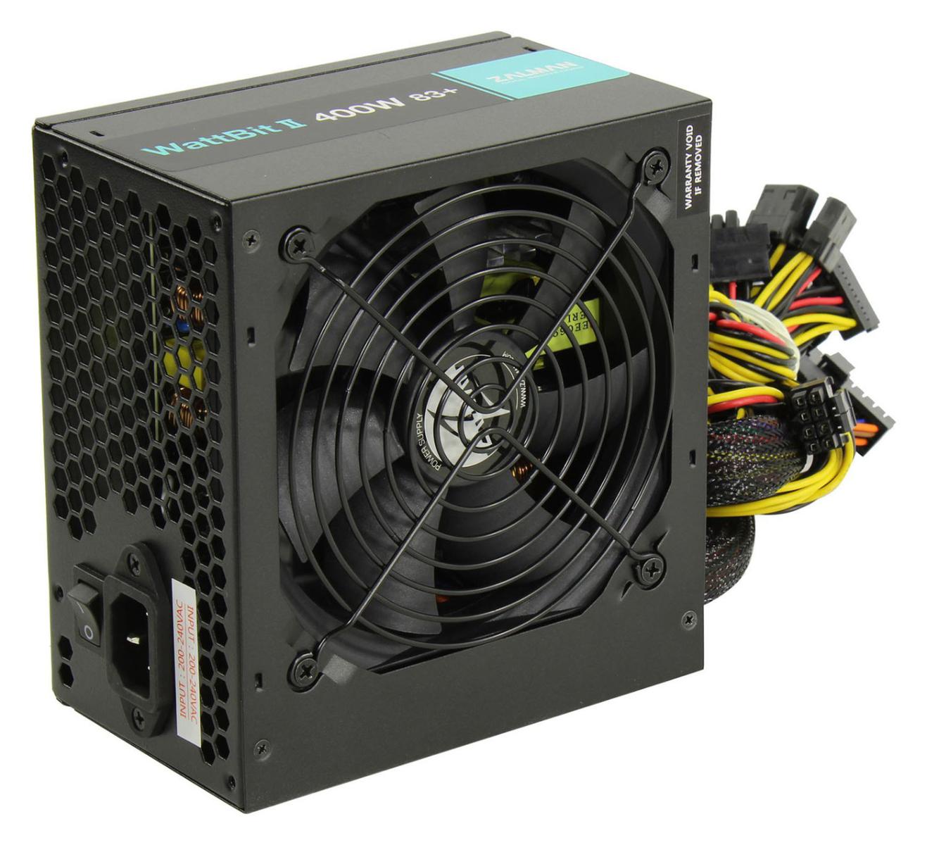 Максимальное энергопотребление этой сборки едва достигнет 100 ватт, а в играх будет и того меньше, ведь TDP видеокарты Intel Arc A310 всего лишь 30 ватт. Поэтому можно обойтись бюджетным блоком питания, которой при такой небольшой нагрузке останется холодным и проработает долго. Я выбрал БП Zalman Wattbit II (ZM400-XEII), который может отдать по линии 12 В 360 ватт. Главные плюсы модели, помимо именитого бренда и низкой цены — наличие систем защиты SCP, UVP, OVP, OPP, тихая работа и достаточно длинные провода.