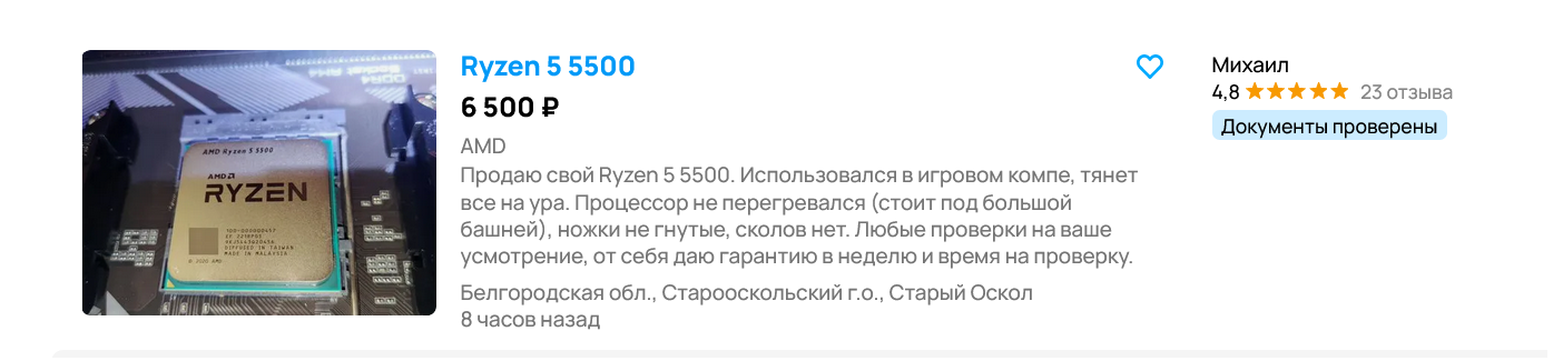 В наш ПК мы будем искать шестиядерник Ryzen 5 5500, который новым стоит в Регарде 9420 рублей, а на б\у рынке его можно найти за 6000-7000 рублей. Это быстрый и холодный камень с отличной производительностью, который справится с довольно мощными видеокартами и выдаст в новых играх стабильные 60 FPS и больше. Но, если в вашем регионе вы не найдете достойных предложений, поищите Ryzen 5 3600, который по производительности отстает от Ryzen 5 5500 всего на несколько процентов, но стоит еще примерно на 1000 рублей дешевле.