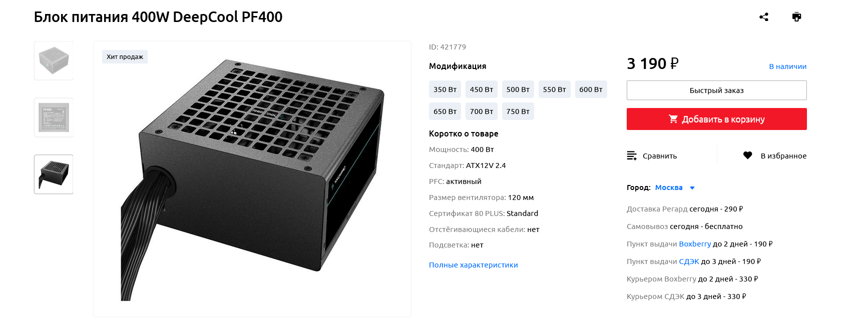 Блок питания тоже лучше взять новым и с гарантией, ведь от его надежности зависит жизнь остальных комплектующих. А учитывая то, что конденсаторы в бюджетных моделях БП теряют свои свойства очень быстро, на экземпляры с возрастом старше двух-трех лет можно даже не смотреть. Лучше взять новый добротный бюджетник, например, DeepCool PF400, мощностью 400 ватт, которой с запасом хватит для нашей сборки.