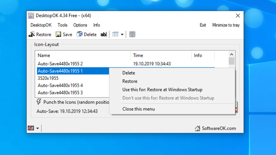 Наверняка вы сталкивались с ситуацией, когда ярлыки на Рабочем столе, которые вы тщательно расставили и привыкли к их расположению, слетают со своих мест после запуска какой-нибудь древней игры, смены разрешения экрана или переустановки видеодрайвера. Это можно предотвратить при помощи крохотной утилиты DesktopOK, которая запоминает расстановку ярлыков, а еще имеет несколько удобных функций. Например, разные профили расстановки ярлыков для разных пользователей, их автоматическое скрытие или сворачивание всех окон.
