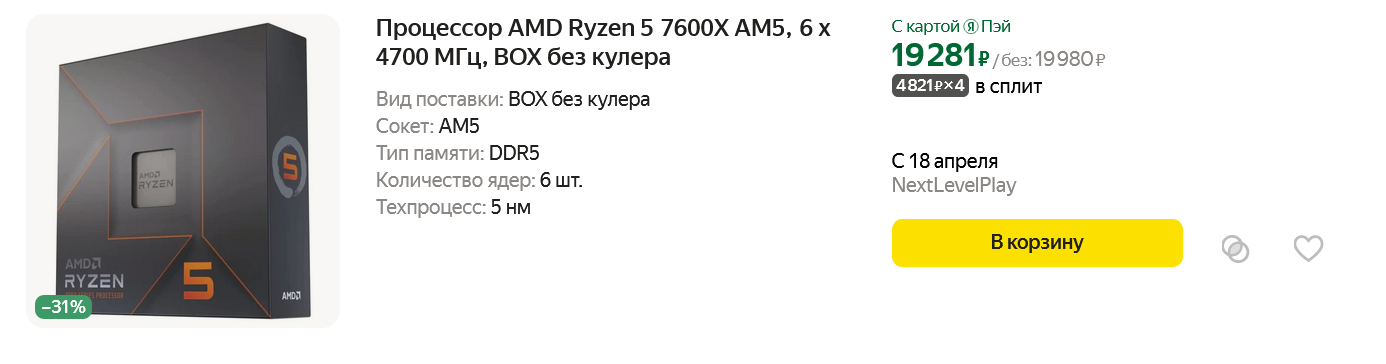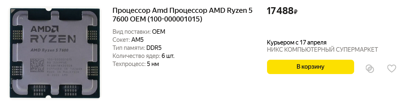 Иногда в продаже встречаются Ryzen 5 7600 по более вкусным ценам, чем более медленные Ryzen 5 7500F и упускать такой шанс не стоит, ведь мы получаем не только более высокие частоты, но и встроенную графику AMD Radeon Graphics, которая очень пригодится, если вы на какое-то время останетесь без дискретной видеокарты.