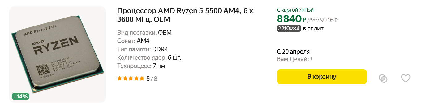 На шестом месте списка расположился бюджетный шестиядерник Ryzen 5 5500, который стал отличным конкурентом для Core i3-12100F и по цене, и по производительности. А еще он очень нетребователен к материнским платам и будет работать в самых недорогих моделях с чипсетом AMD A320 или AMD B450.