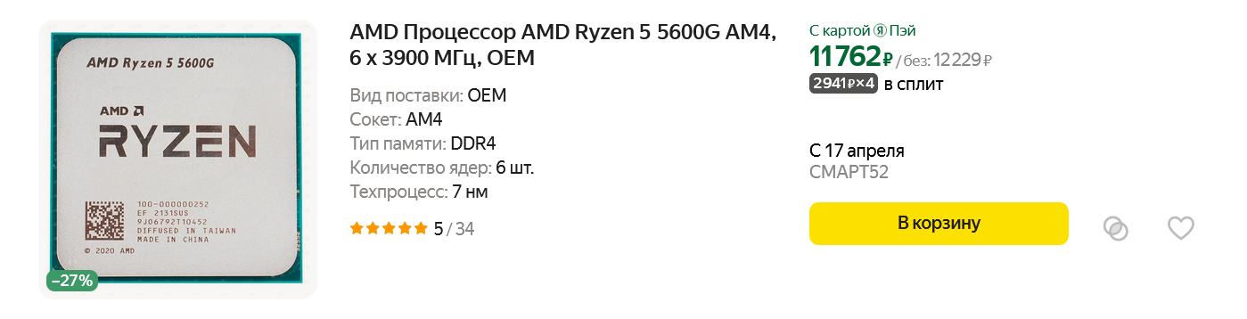 На последнем месте расположился единственный процессор с мощной встроенной графикой — Ryzen 5 5600G. Эту модель часто берут те пользователи ПК, которым нужны производительные ядра процессора, а для набора их игр хватает производительности графики уровня GeForce GTX 1050. А если посмотреть на цену практически идентичного по устройству, но без встроенной графики, шестиядерника Ryzen 5 5500, то становится понятно, что это очень выгодное приобретение. Получить такую графику по цене 3000 рублей — это очень и очень заманчиво, а в будущем ничто не помешает поставить в пару к Ryzen 5 5600G видеокарту Radeon RX 7600 или GeForce RTX 4060.