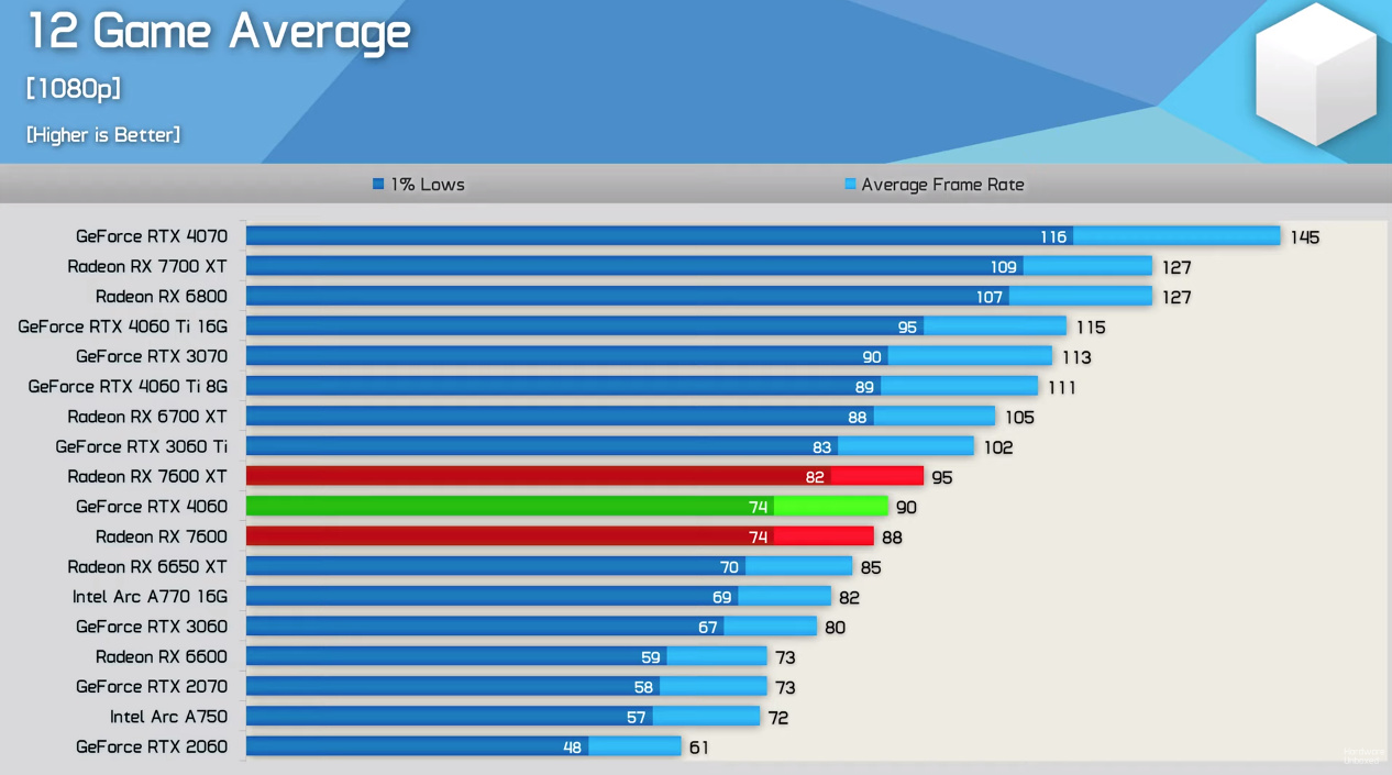 Сводная производительность актуальных видеокарт в разрешении 1080p от канала Hardware Unboxed