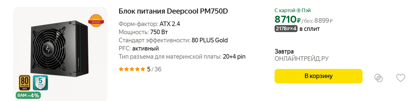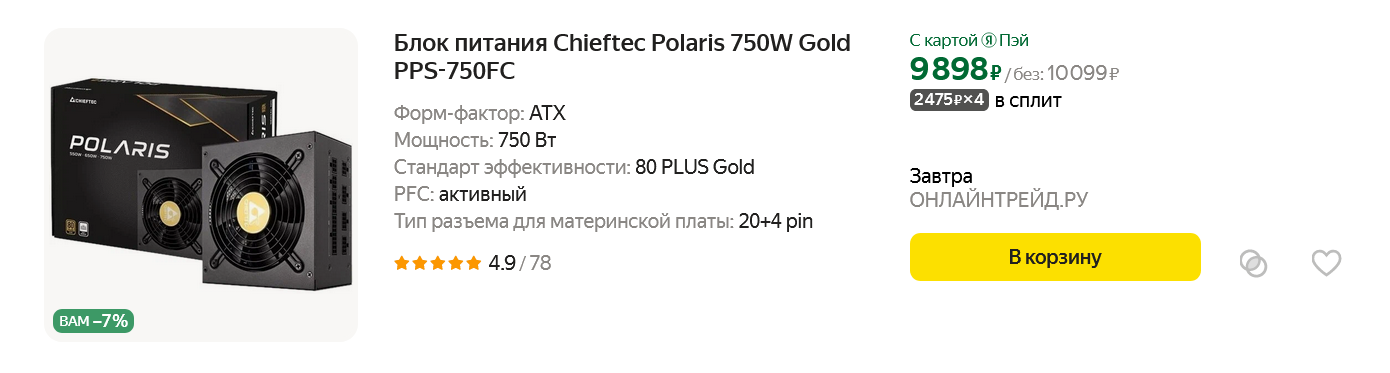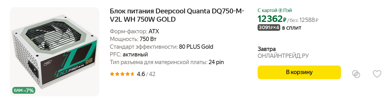 Но, если вы хотите по-настоящему долговечный блок питания, то одного запаса мощности мало, нужно еще доплатить за бренд и качество. Ведь в топовых моделях с сертификатом 80 PLUS Gold будут надежные японские и тайваньские конденсаторы, зачастую даже твердотельные, набор всевозможных защит, современная схемотехника на основе DC-DC преобразователей и LLC-резонатора. А еще — модульные провода со всеми нужными разъемами и качественный, тихий вентилятор. В 2024 году за такой блок питания придется отвалить не меньше 8700 рублей. На Яндекс Маркете я нашел несколько таких моделей: