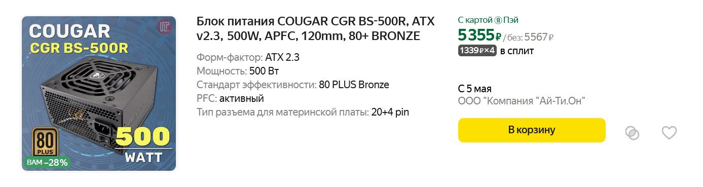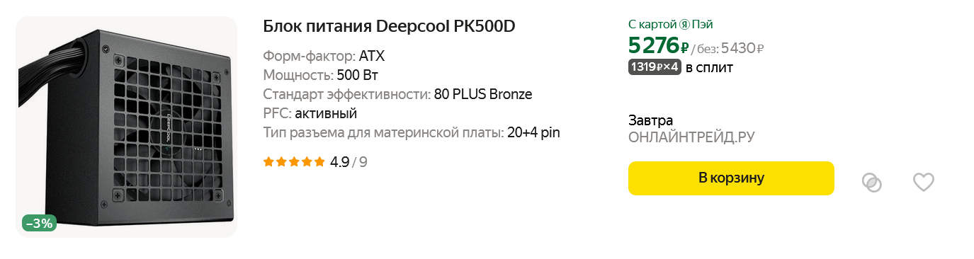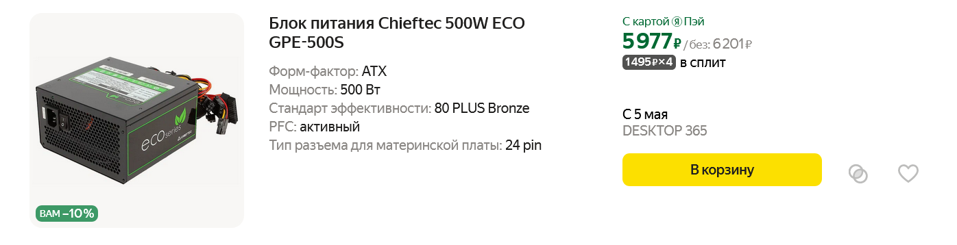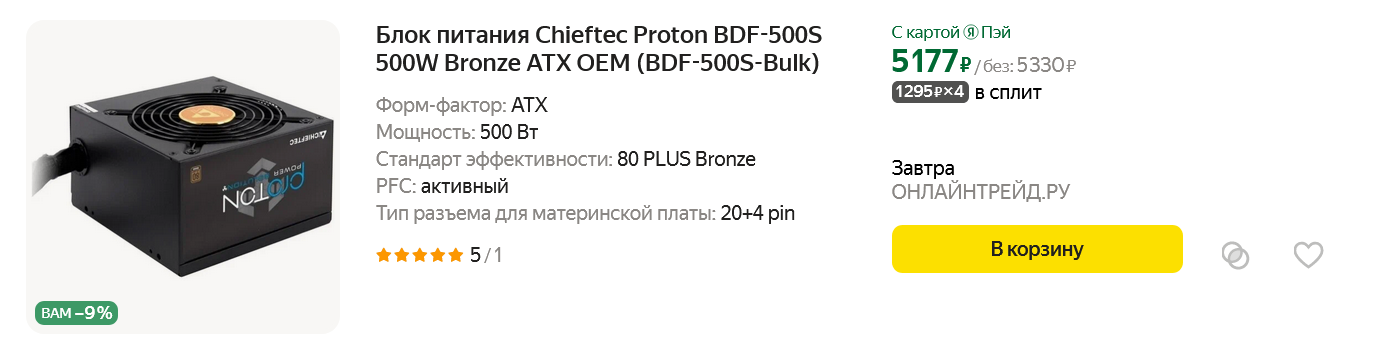 Учитывая все это, у меня полностью пропало желание покупать "железо" с запасом, и сегодня для своего ПК я бы выбрал качественный БП мощность 500 ватт, например: