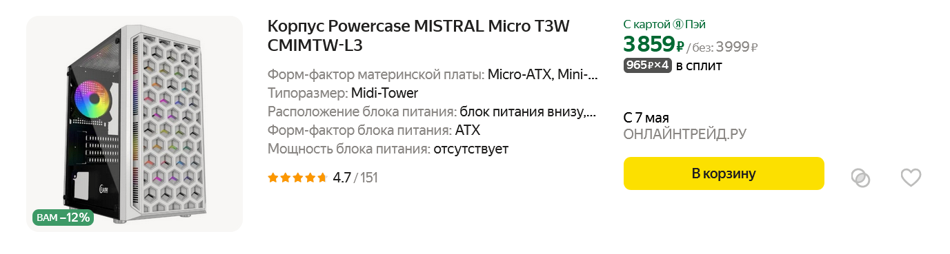 Остается подобрать вместительный корпус с хорошей вентиляцией и здесь главное не продешевить, ведь новый ПК должен радовать глаз и выглядеть современно. Поэтому серые страшненькие коробки за 2000 рублей мы сразу отметаем и соберем эту сборку в Powercase MISTRAL Micro T3W CMIMTW-L3, симпатичном корпусе с оригинальной и хорошо продуваемой передней панелью.